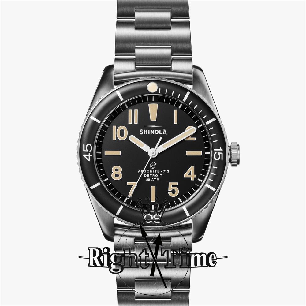 Shinola Detroit Duck Collection Model S0120183128 powered by quarts movement. Black dial with large luminous Arabic numerals and indexes. Comes in stainless steel case with bracelet and aditional black rubber band. Water resistant to 200 meters