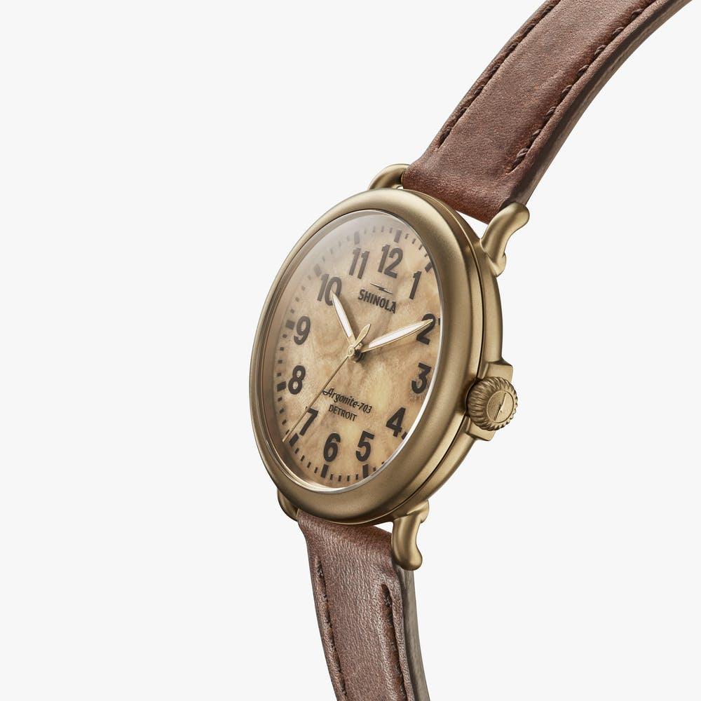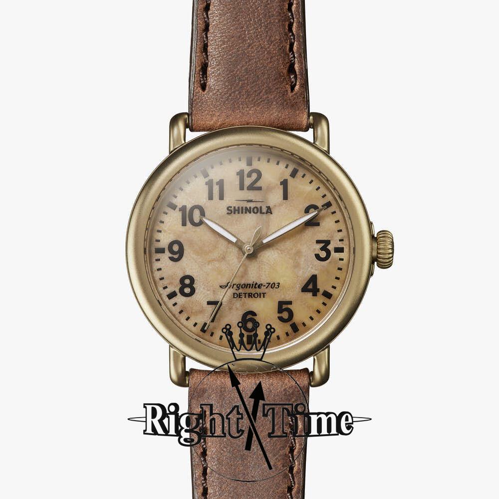 Shinola Detroit Runwell Collection Model S0120183142 powered by quarts movement. Petoskey Stone dial with black Arabic numerals. Comes in khaki color PVD plated stainless steel case on tan leather band.