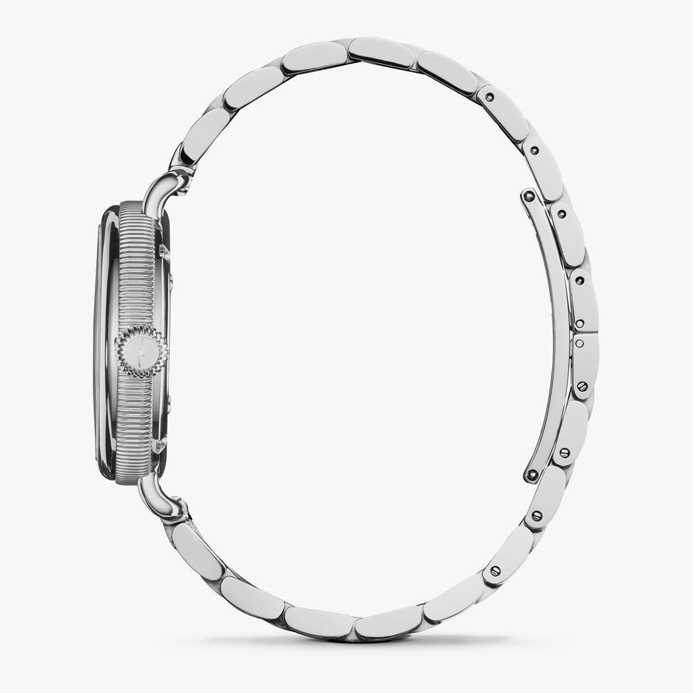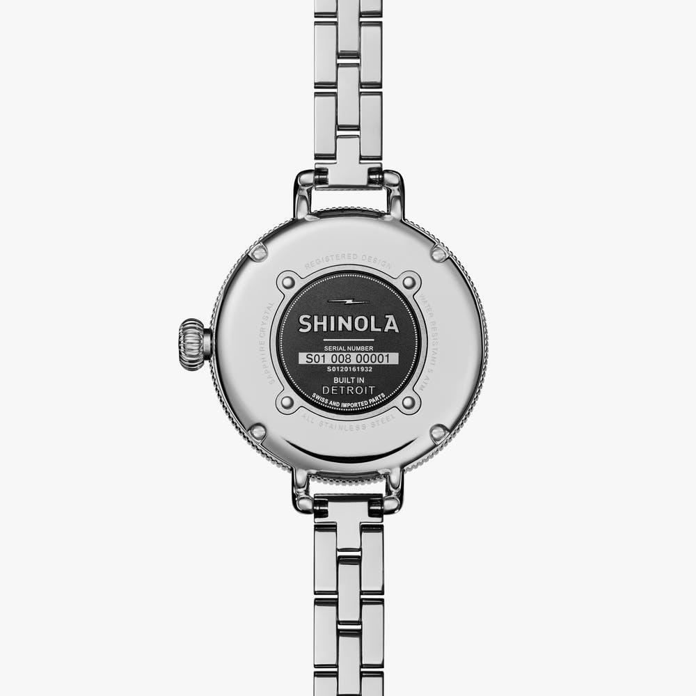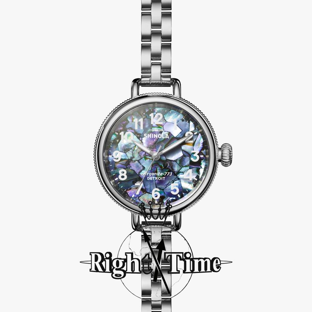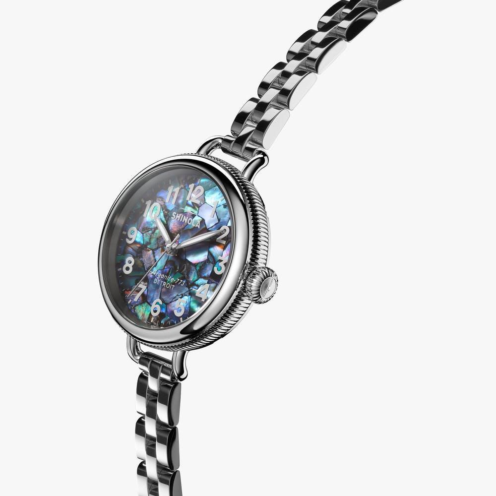 Shinola Detroit Birdy Collection Model S0120183155 powered by quarts movement. Abalone dial with Arabic numerals. Comes in stainless steel case with bracelet.