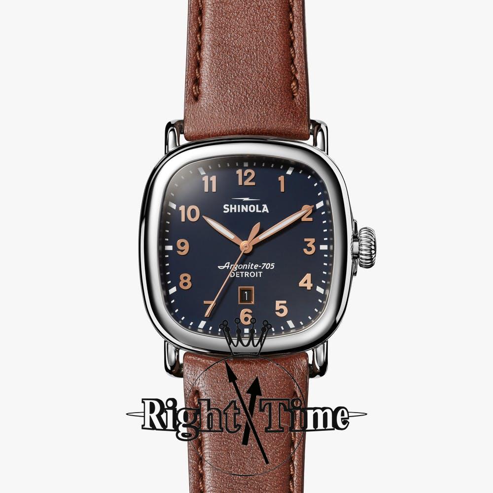 Shinola Detroit Guardian Collection Model S0120194181 powered by quarts movement. Midnight blue dial with Arabic numerals and date calendar. Comes in stainless steel plated case with brown leather band.