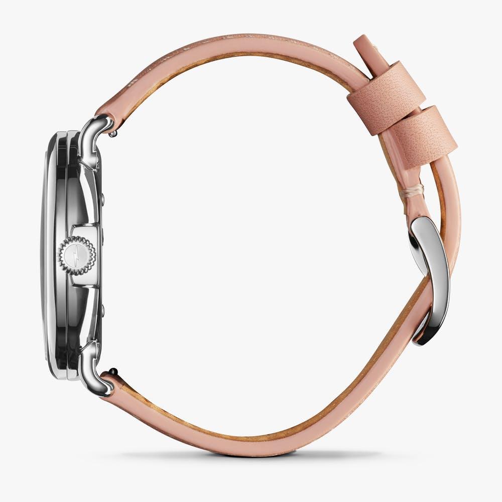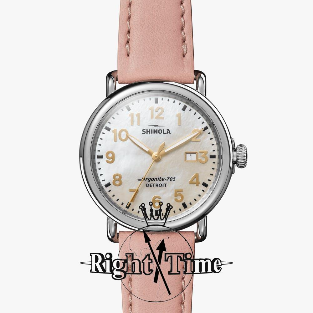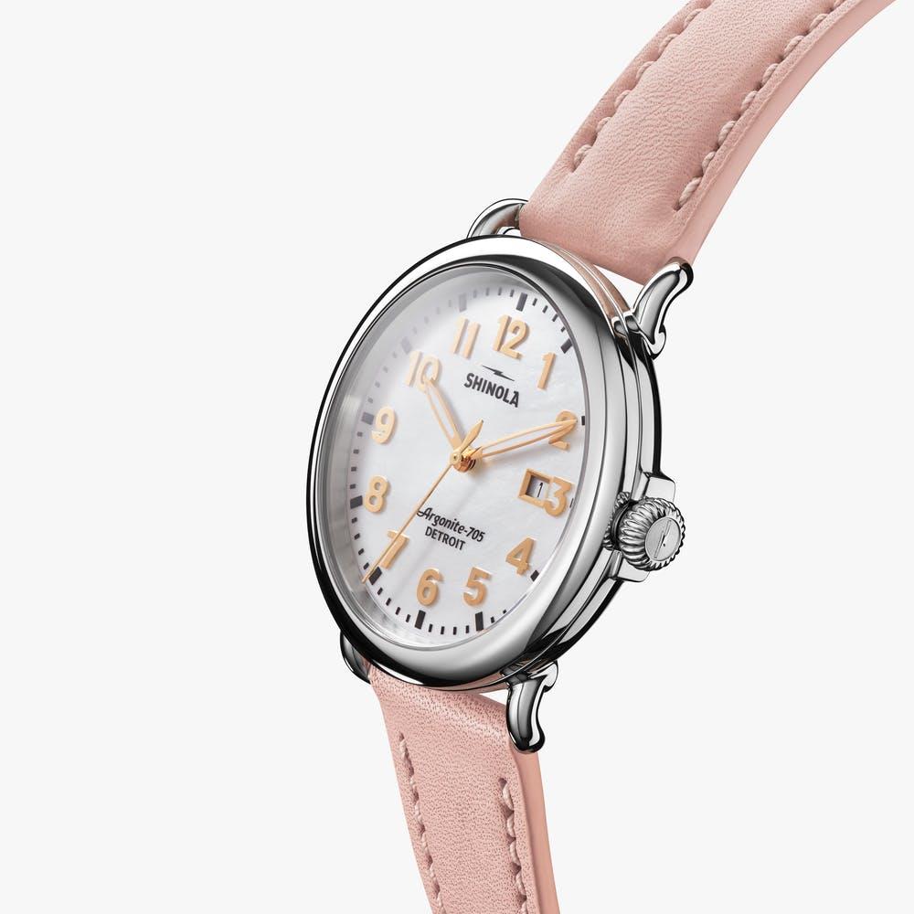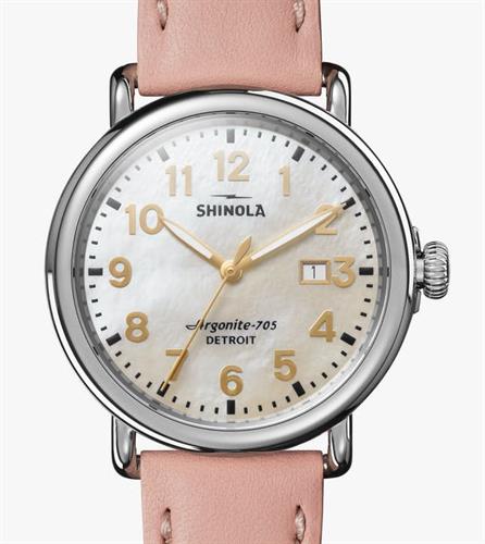 Shinola Detroit Runwell Collection Model S0120194483 powered by quarts movement. White Mother-of-Pearl dial with gold tone Arabic numerals and date calendar. Comes in stainless steel case on pink leather band.