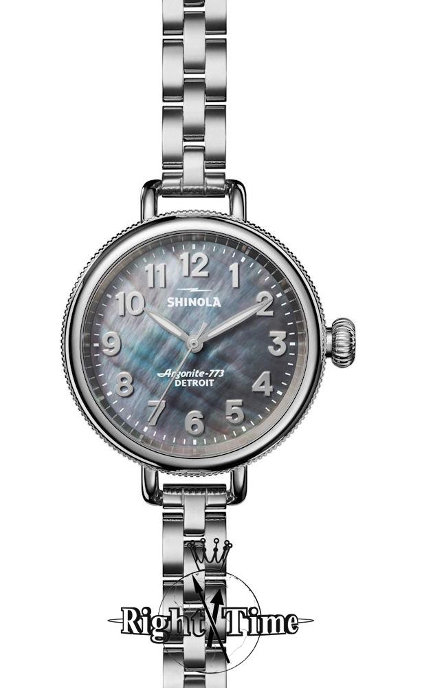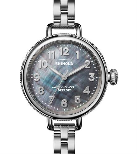 Shinola Detroit Birdy Collection Model S0120195479 powered by quarts movement. Black Mother-of-Pearl dial with Arabic numerals. Comes in stainless steel case with bracelet.