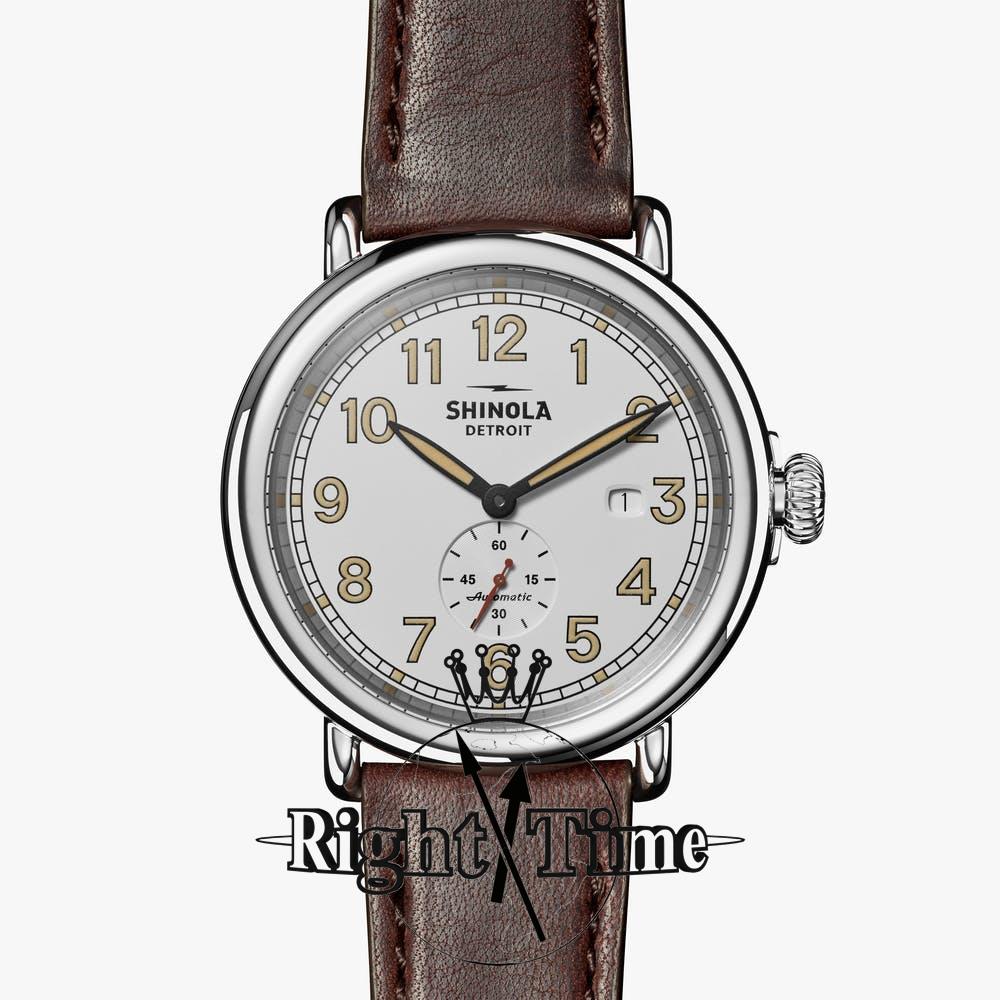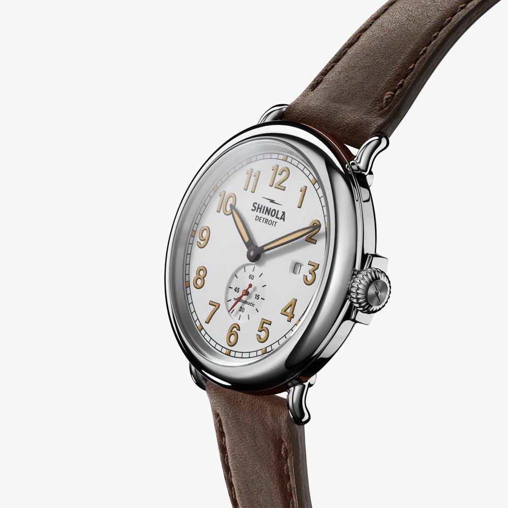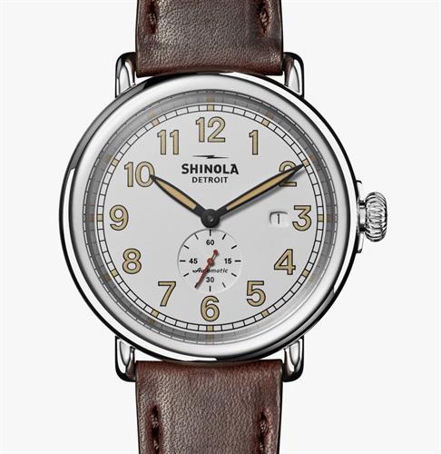 Shinola Detroit Runwell Station Agent model S0120203780. Detroit assembled Swiss automatic movement with small seconds platform. Sandblasted 45mm case made of solid stainless steel. White dial with Arabic numerals. Brown leather strap with tang buckle and quick-release function.