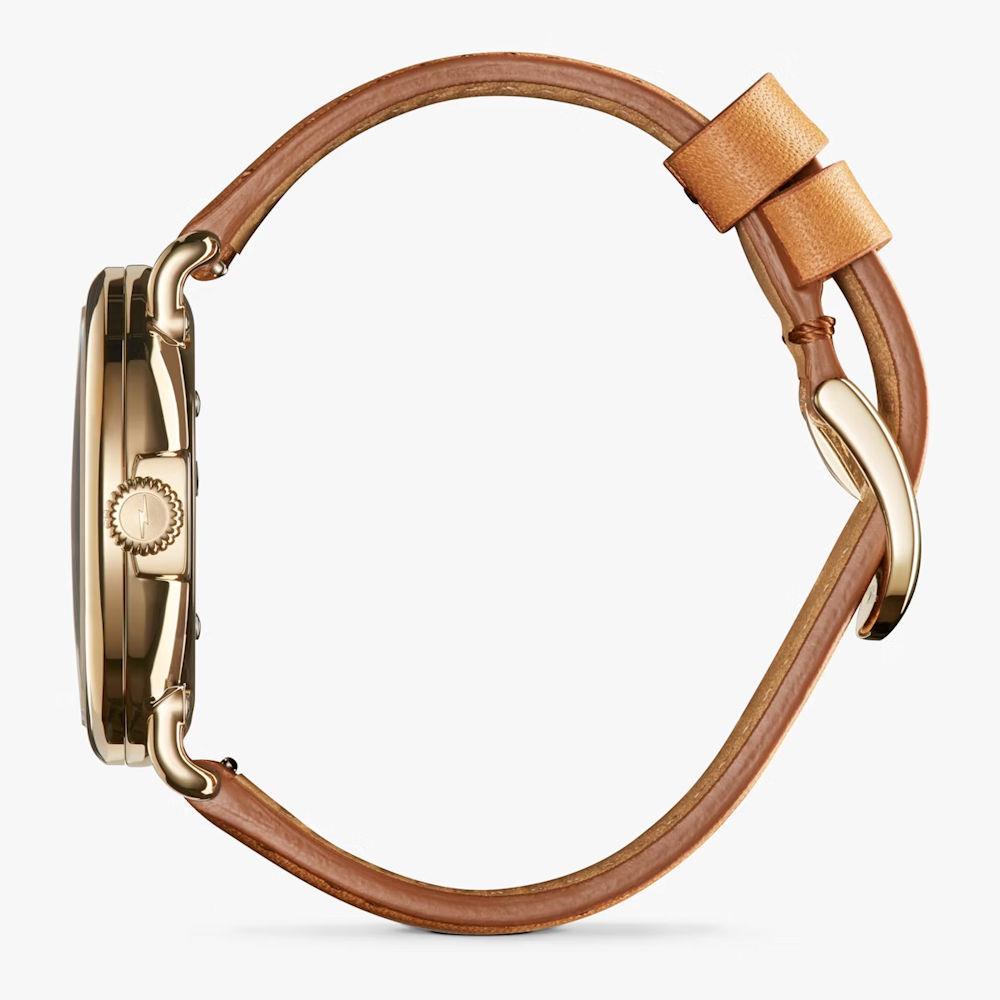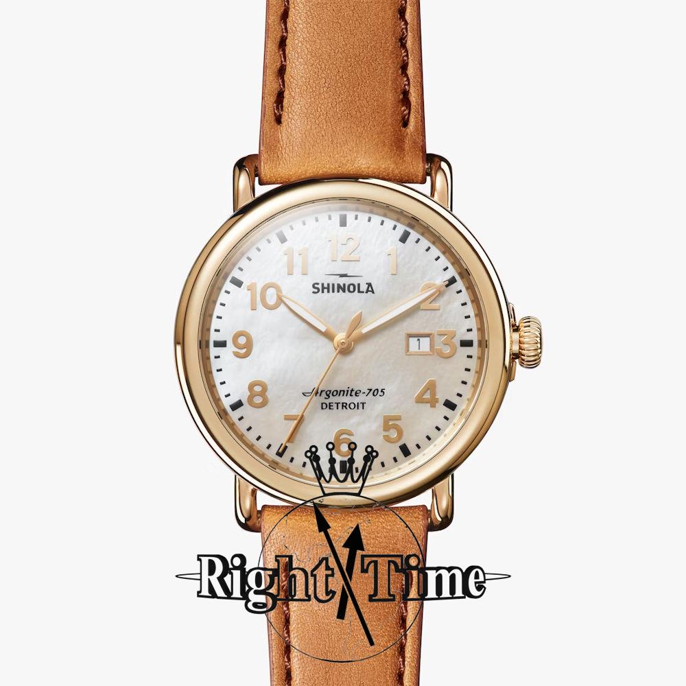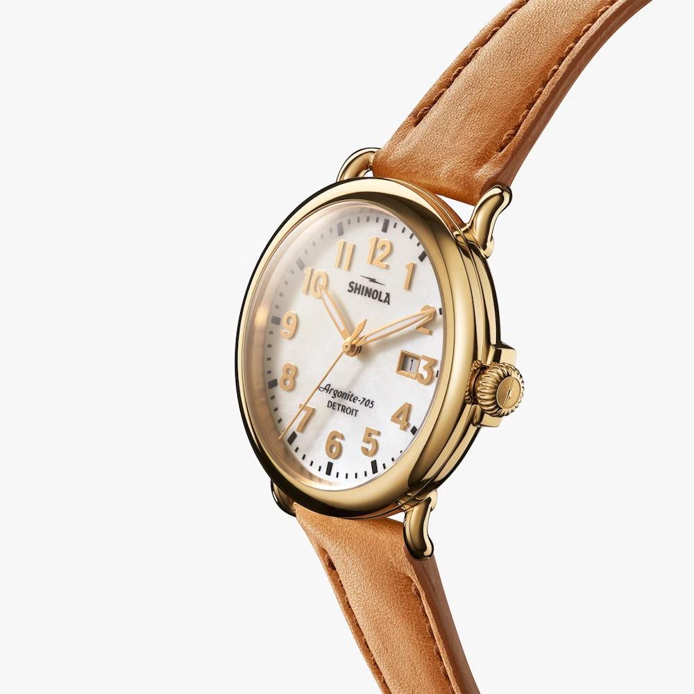 Shinola Detroit Runwell Collection Model S0120210678 powered by quarts movement. White Mother-of-Pearl dial with golden color Arabic numerals and date calendar. Comes in stainless steel gold plated case on tan leather band.