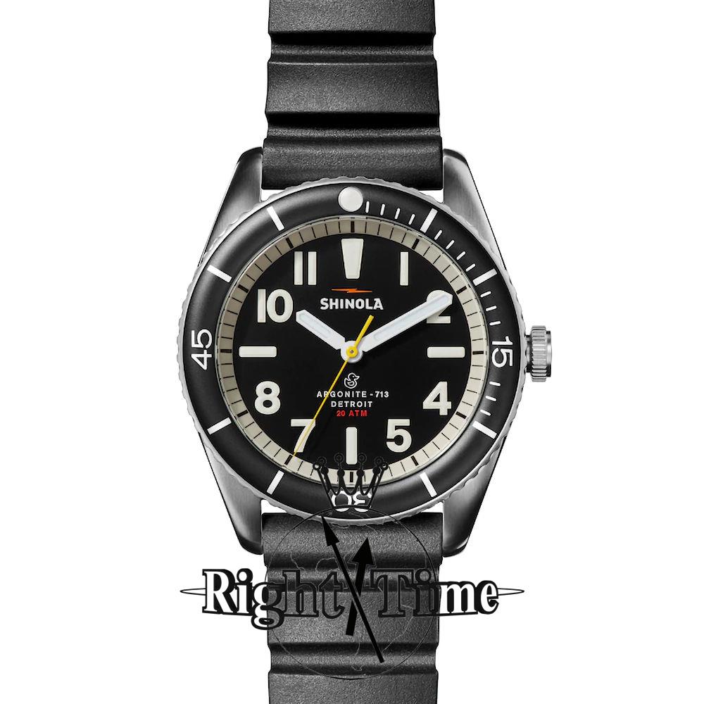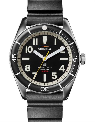 Shinola Detroit Duck Collection Model S0120211229 powered by quarts movement. Black dial with large luminous Arabic numerals and indexes. Comes in stainless steel case with black rubber band. Water resistant to 200 meters