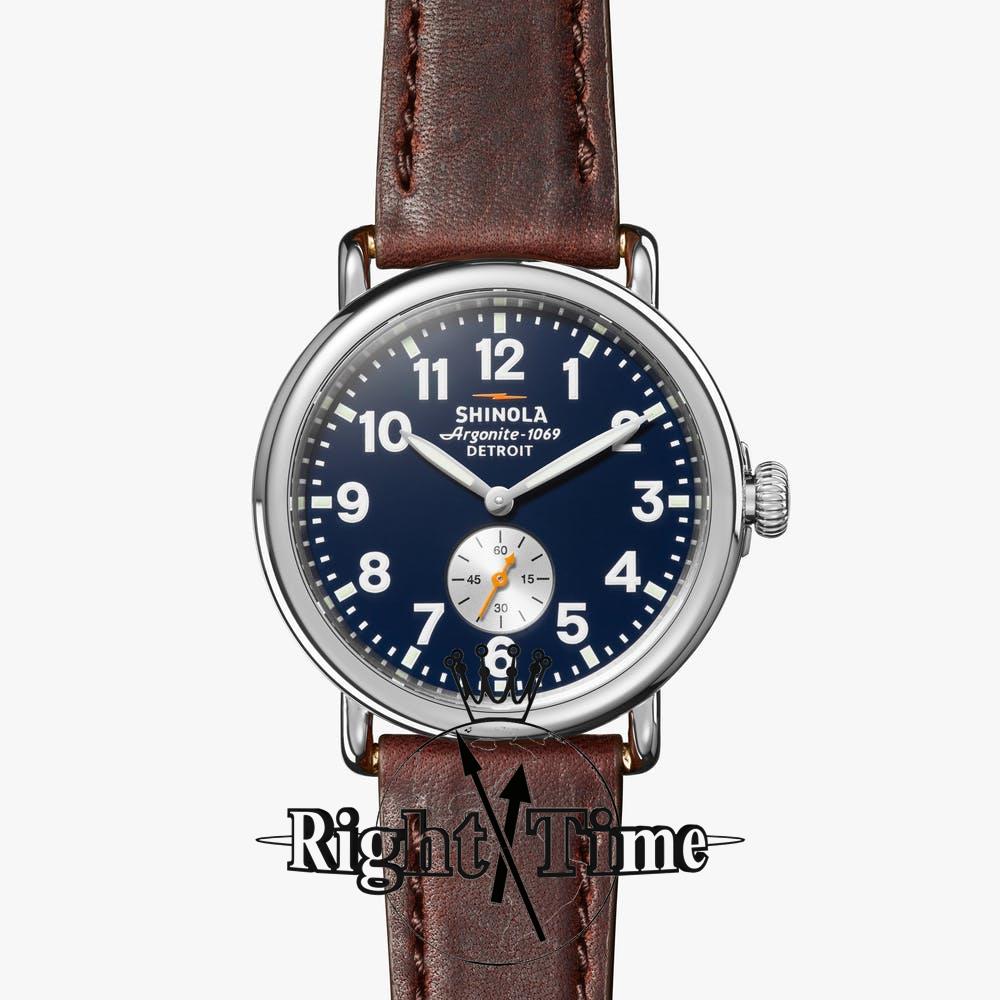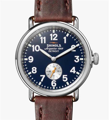 Shinola Detroit Runwell Collection Model S0120224035 powered by quarts movement. Midnight blue color dial with white color Arabic numerals and small seconds sub-dial. Comes in stainless steel case on brown leather band.