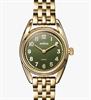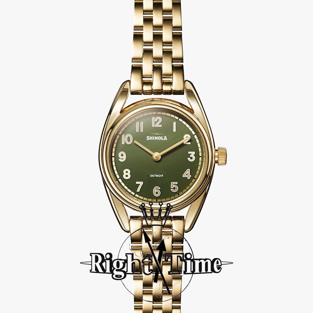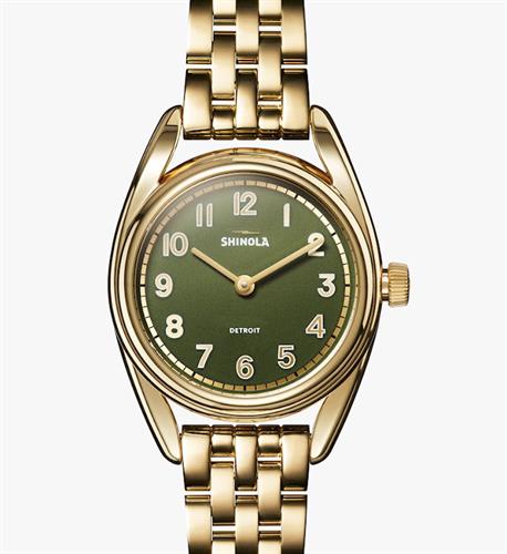 Shinola Detroit Derby Collection Model S0120226478 powered by quarts movement. Olive green dial with Arabic numerals. Comes in gold plated stainless steel case with bracelet. Inspired by the bend of a horseshoe