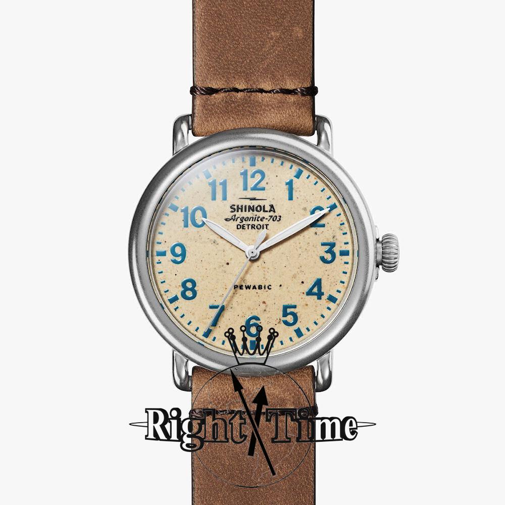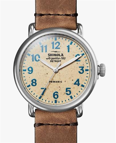 Shinola Detroit Runwell Collection Model S0120230582 powered by quarts movement. Pewabic stone dial with blue color Arabic numerals. Comes on tan leather band.