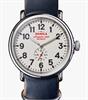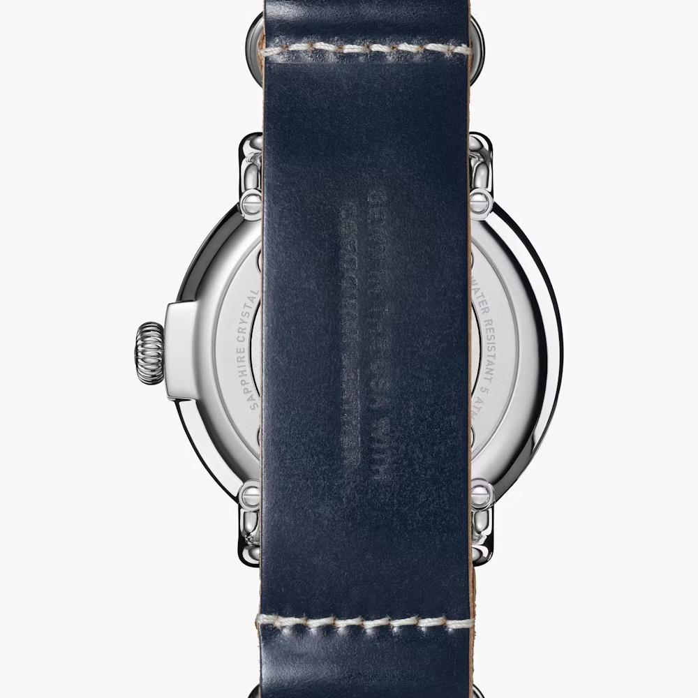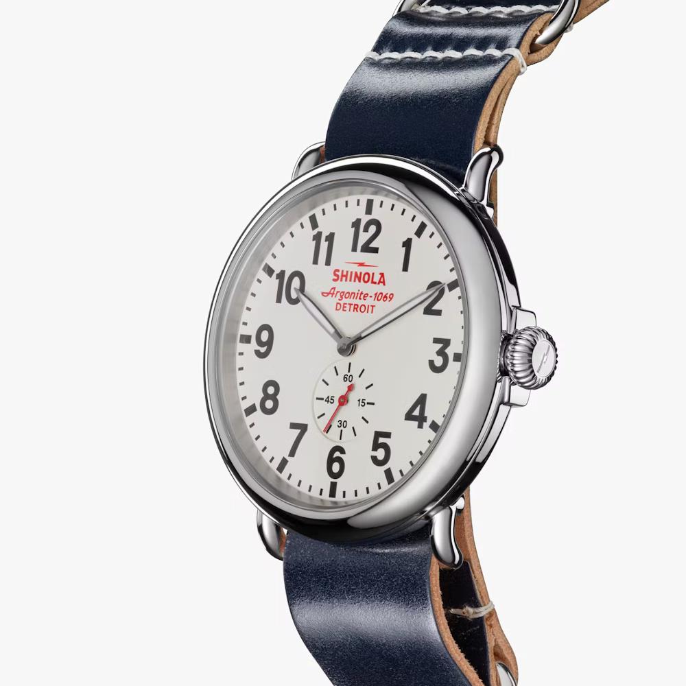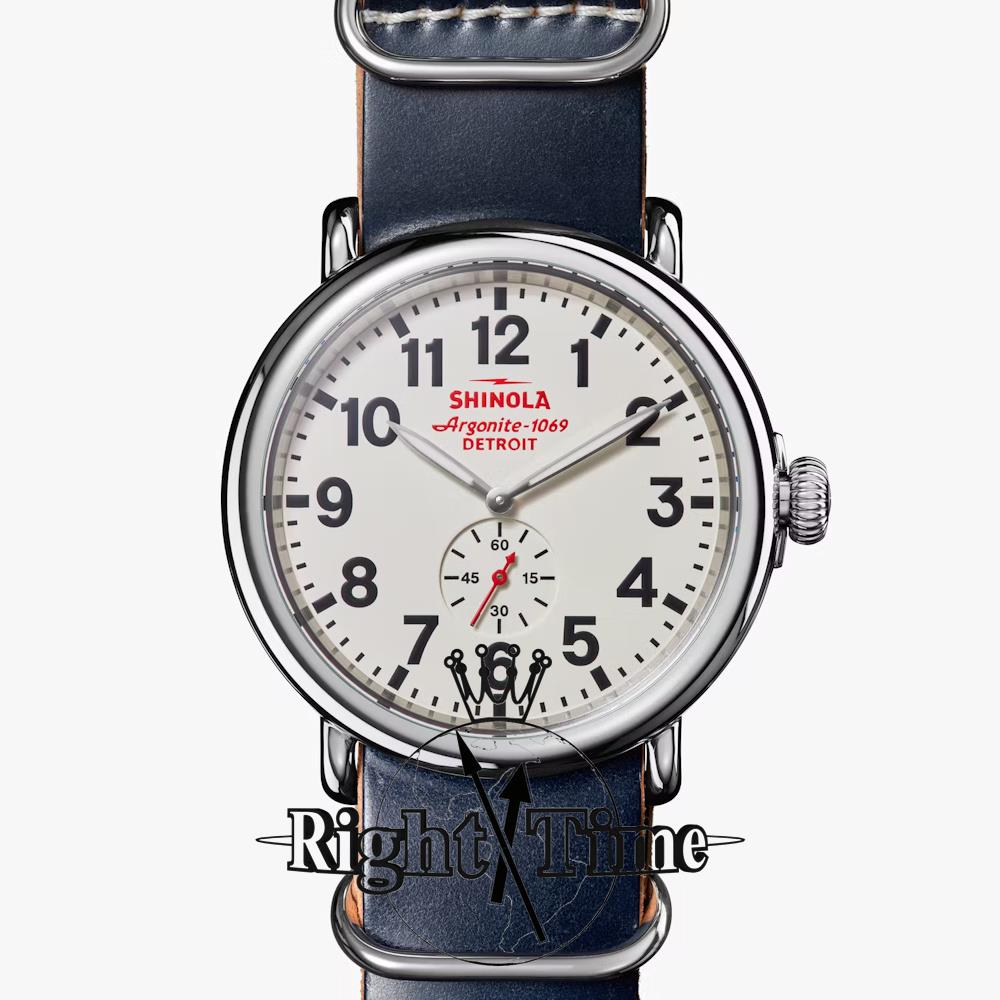 Shinola Detroit Runwell Collection Model S0120242433 powered by quarts movement. White dial with black color Arabic numerals and small seconds sub-dial. Comes in stainless steel case on navy blue leather band.
