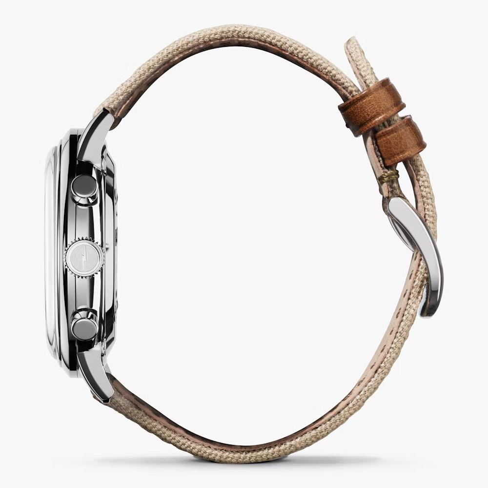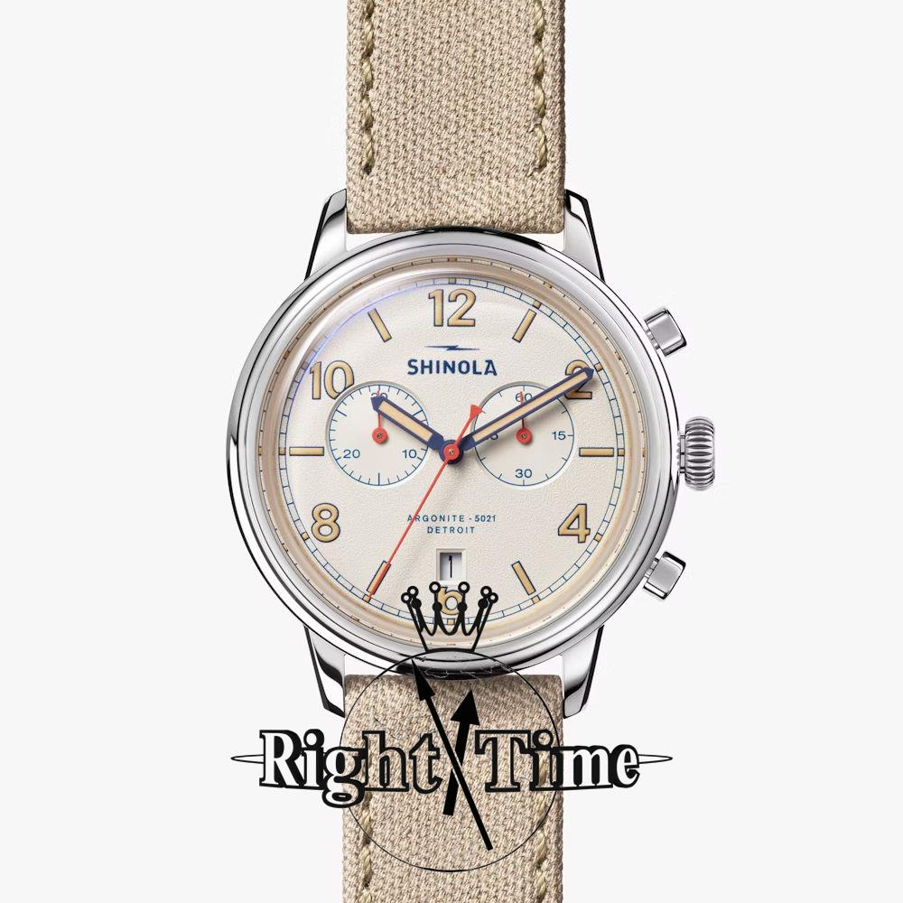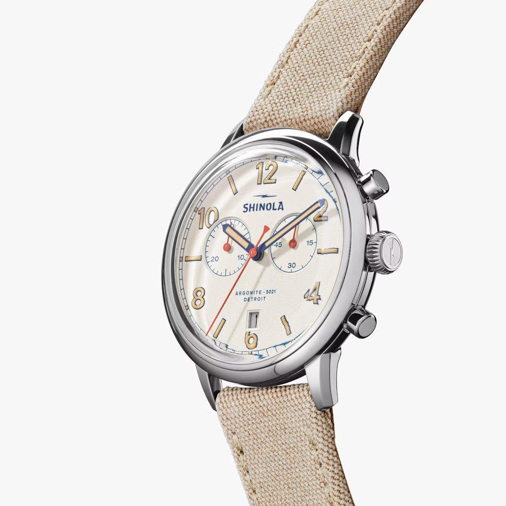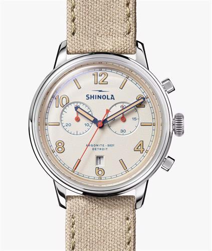 Shinola Detroit Traveler Collection Model S0120245785 powered by quarts chronograph movement. Alabaster dial with luminous Arabic numerals. Comes in 42mm stainless steel case on Dune color canvas strap.