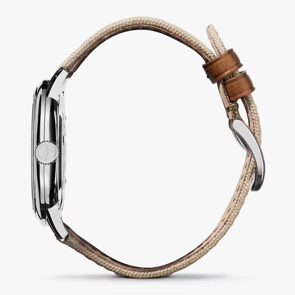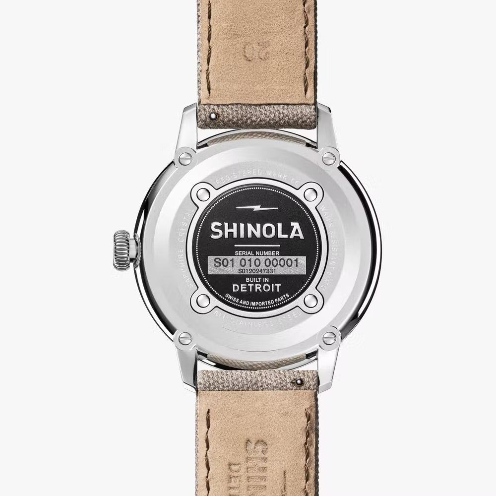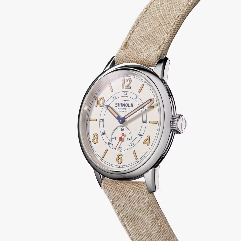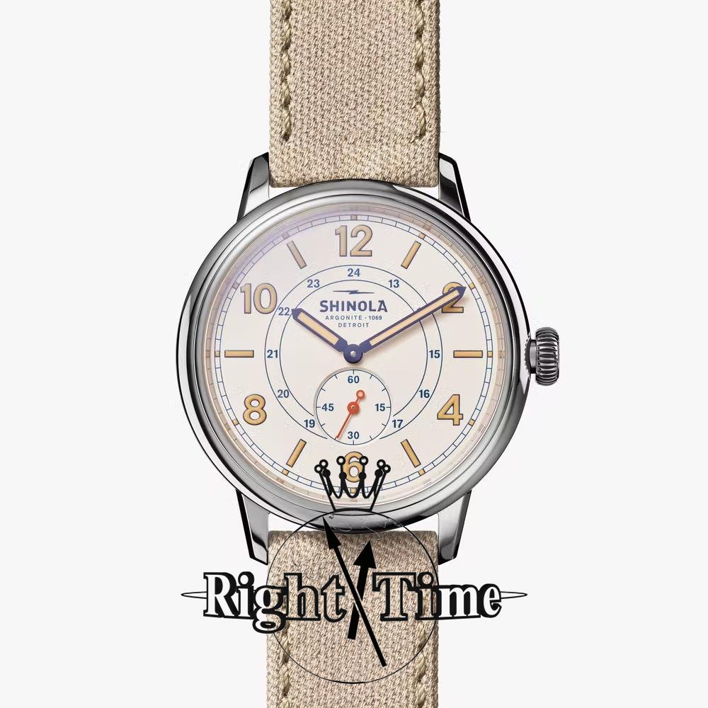 Shinola Detroit Traveler Collection Model S0120247331 powered by quarts movement. White dial with luminous Arabic numerals and small seconds sub-dial. Comes in 42mm stainless steel case on canvas strap.