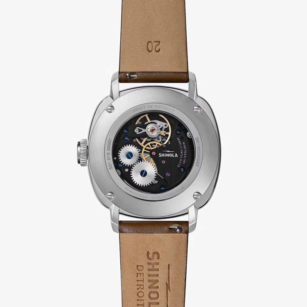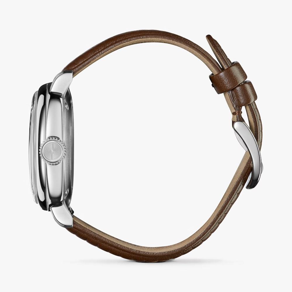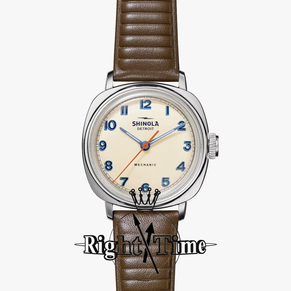 Shinola Detroit Mechanic Collection Model S0120250593 powered by mechanical hand-wounded movement. White dial with blue Arabic numerals. Comes in stainless steel case on a brown leather strap.