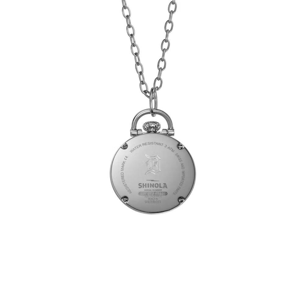 Shinola Detroit Runwell pendant neckless model S0120256028 powered by quarts movement. White dial with Arabic numeral. 24mm stainless steel case. 30 inch chain