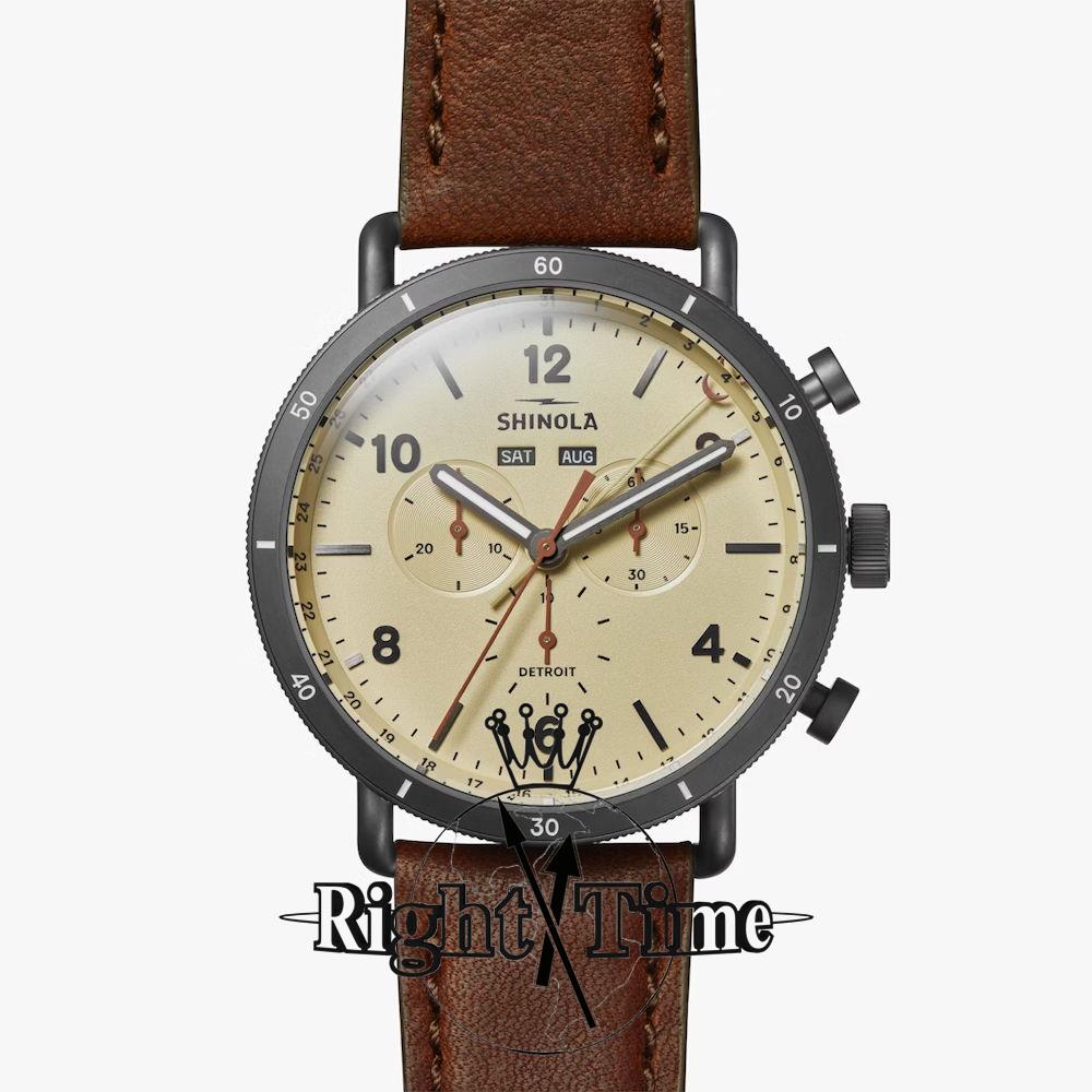 Shinola Detroit Canfield Sport Collection Model S0120273180 powered by quarts chronograph movement. Cream color dial, black Arabic numerals and date pointer hand. Comes in black plated stainless steel case on brown leather band.