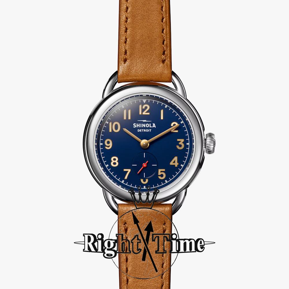 Shinola Detroit Runabout Collection Model S0120273248 powered by quarts movement. Navy blue dial with seconds sub-dial and golden Arabic numerals. Comes in stainless steel case on bourbon color leather band.
