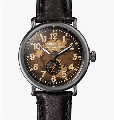 Shinola Detroit Runwell Collection Model S0120291083 powered by quarts movement. Brown Oak Camouflage dial with Arabic numerals and seconds sub-dial. Comes in black plated stainless steel case on black leather band.