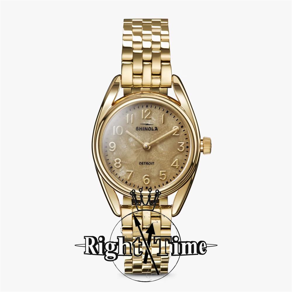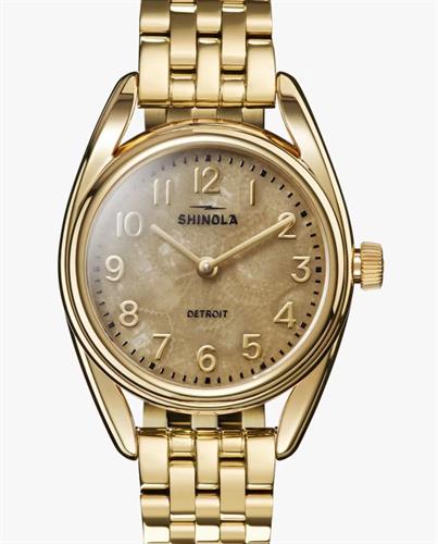 Shinola Detroit Derby Collection Model S0120299734 powered by quarts movement. Petoskey stone dial with Arabic numerals. Comes in stainless steel gold plated case with bracelet. Inspired by the bend of a horseshoe