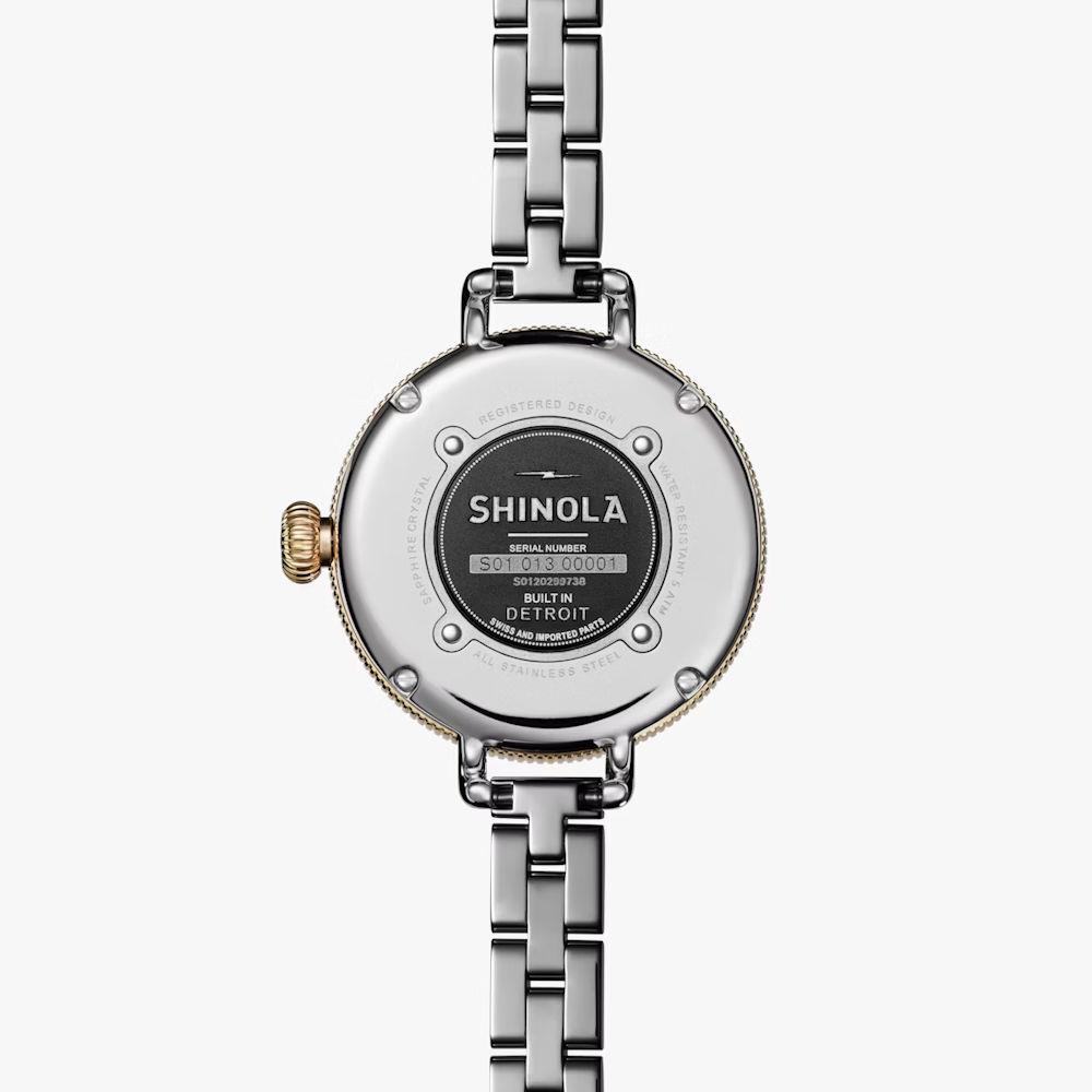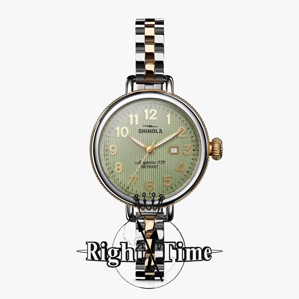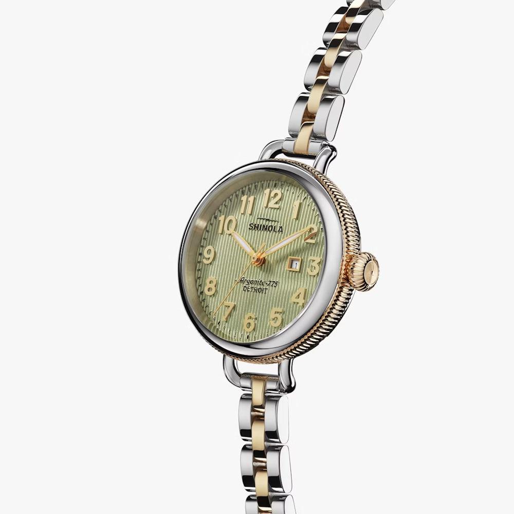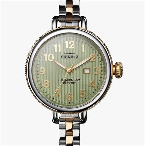 Shinola Detroit Birdy Collection Model S0120299738 powered by quartz movement. Eucalyptus green dial with Arabic numerals. Comes in stainless steel case with bracelet and gold PVD plated accents.