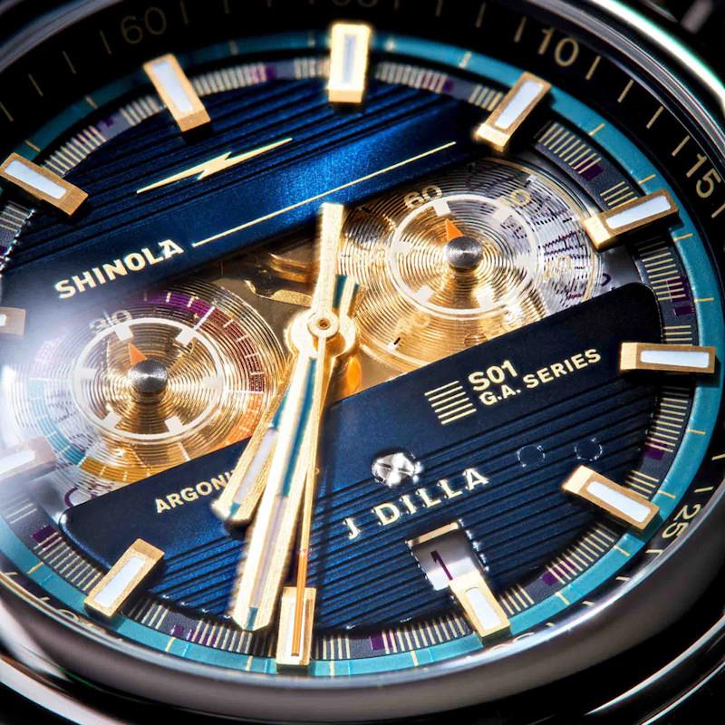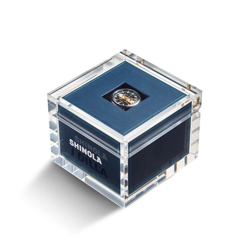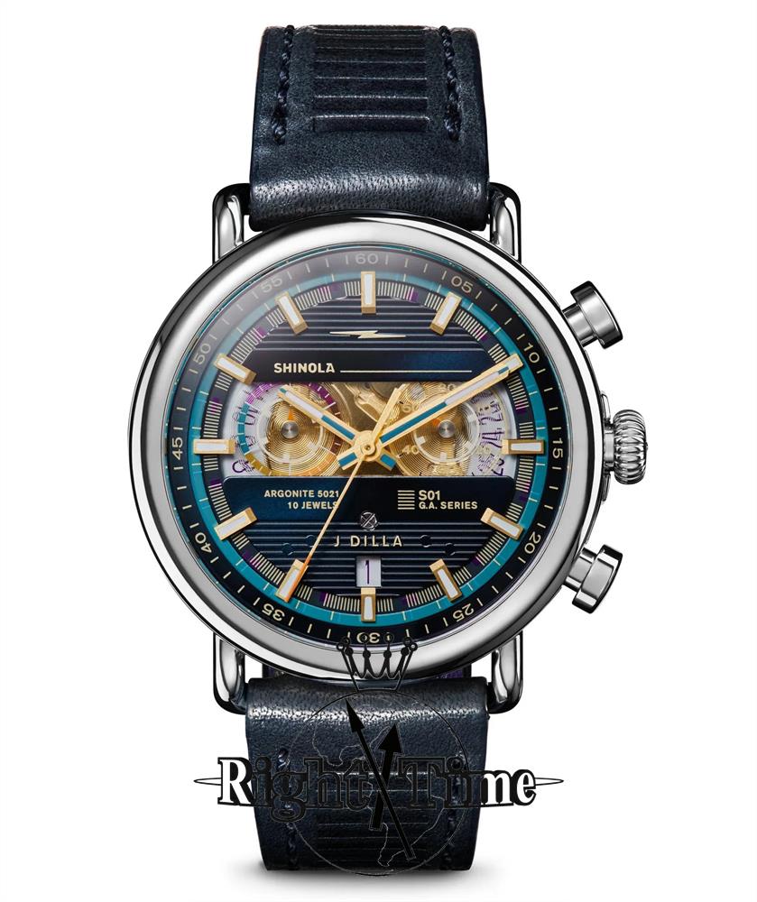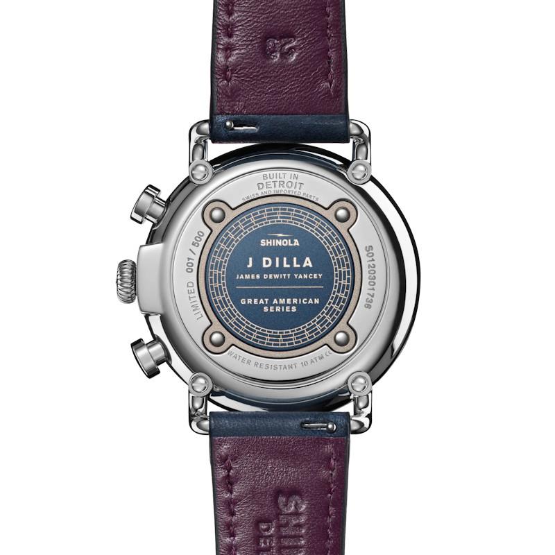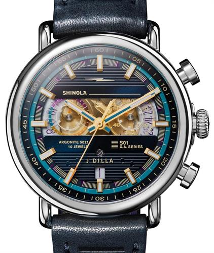 Shinola Runwell J Dilla Limited Edition model S0120301728. Limited to only 500 pieces Worldwide. Made in tribute to Detroit born hip-hop legend J Dilla. The Ronda 5021.D quartz chronograph movement is hand-assembled at the Argonite factory in Detroit, MI. High polished 316L stainless steel case. Stunning multi-color partial skeleton dial with luminous hands and markers. Double domed sapphire crystal. Comes on a blue leather strap, embossed with J Dilla`s name on the back, and 8 bars on the front. Rated 100m water resistant.