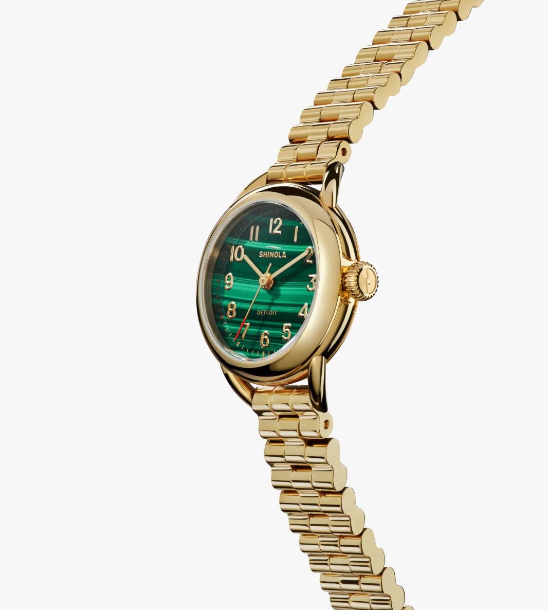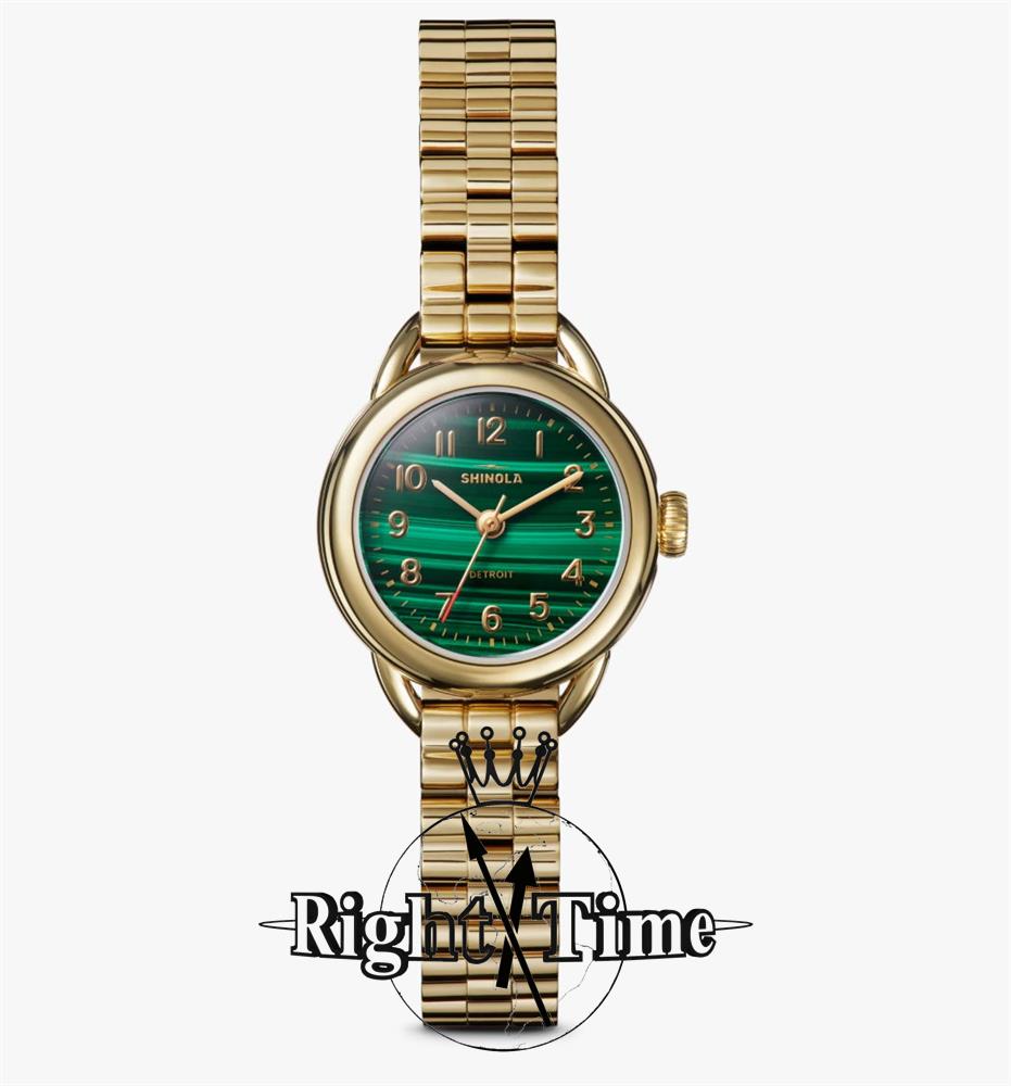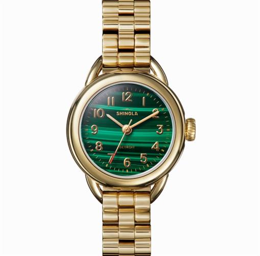 Shinola Detroit Runabout Collection Model S0120307510 powered by quarts movement. Green Malachite dial with golden Arabic numerals. Comes in stainless steel case on bracelet