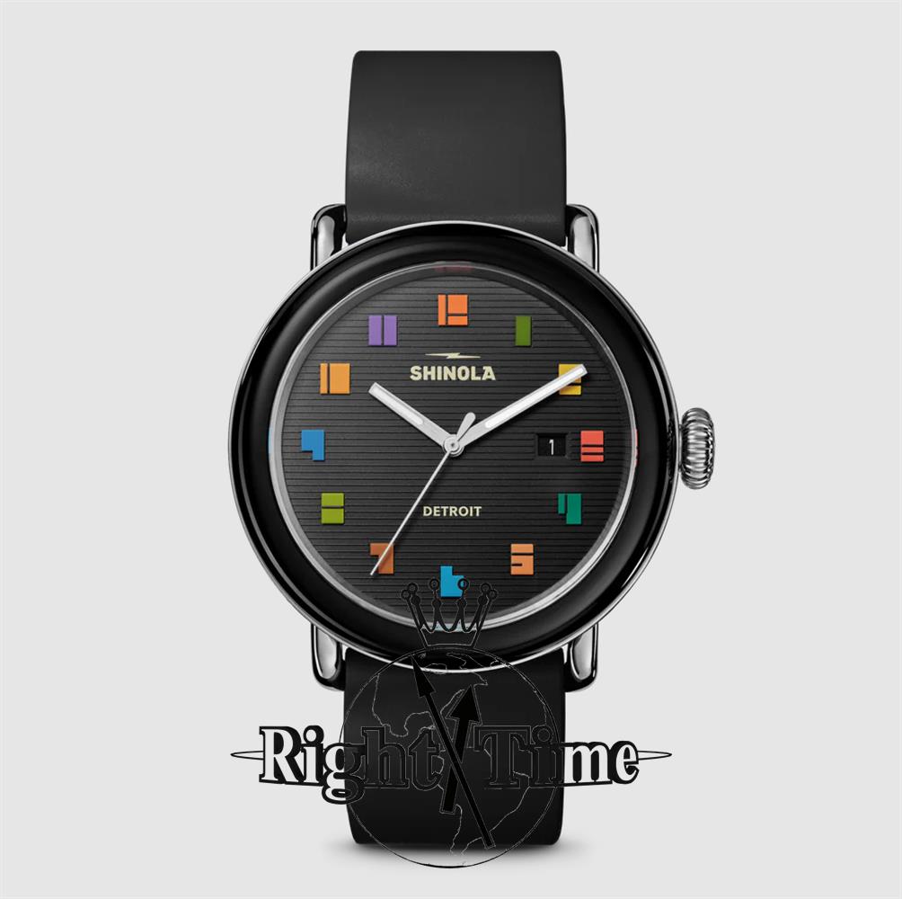 Shinola Detroit Detrola Collection Model S0120307633 powered by quarts movement. Black color dial with date calendar and multi color numerals. Stainless steel and TR90 Resin case. Black color silicone strap