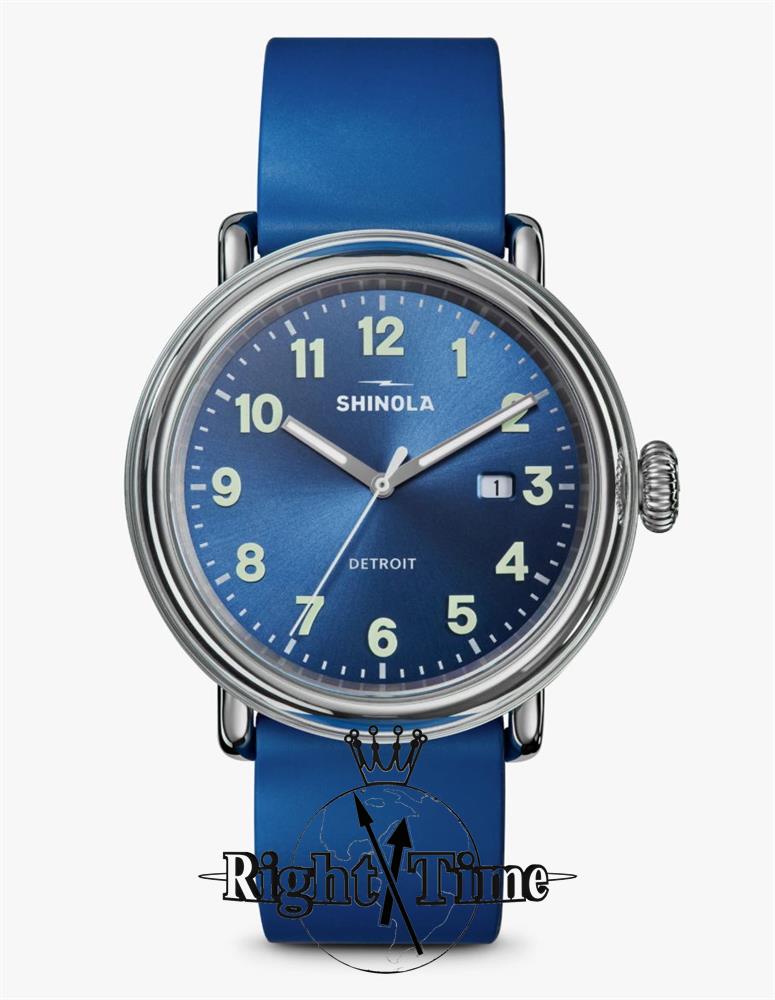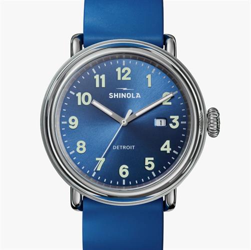 Shinola Detroit Detrola Collection Model S0120307643 powered by quarts movement. Blue color dial with date calendar and Arabic numerals. Stainless steel and TR90 Resin case. Blue color silicone strap
