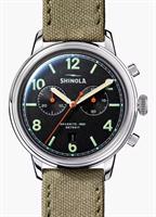 Shinola Detroit Traveler Collection Model S0120245782 powered by quarts chronograph movement. Black dial with luminous Arabic numerals. Comes in 42mm stainless steel case on fatigue canvas strap.