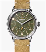 Shinola Detroit Traveler Collection Model S0120247331 powered by quarts movement. White dial with luminous Arabic numerals and small seconds sub-dial. Comes in 42mm stainless steel case on canvas strap.