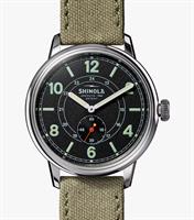 Shinola Detroit Traveler Collection Model S0120247330 powered by quarts movement. Black dial with luminous Arabic numerals and small seconds sub-dial. Comes in 42mm stainless steel case on fatigue canvas strap.