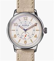 Shinola Detroit Traveler Collection Model S0120245785 powered by quarts chronograph movement. Alabaster dial with luminous Arabic numerals. Comes in 42mm stainless steel case on Dune color canvas strap.