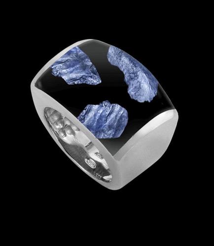 Soho sterling silver ring with black enamel, gold leaf inlay and added blue sapphire pigment. Handcrafted in Italy.