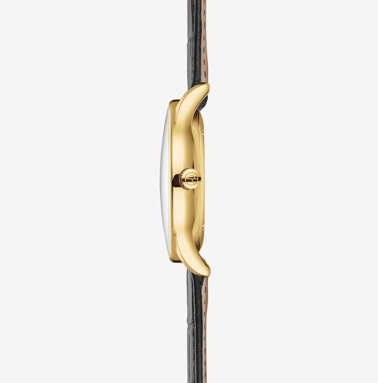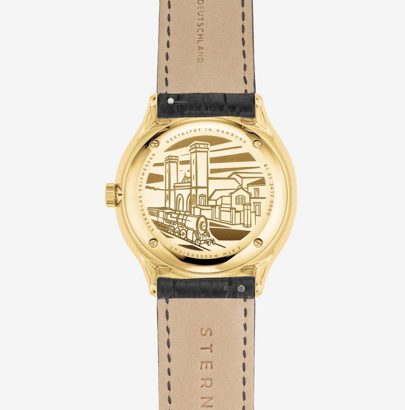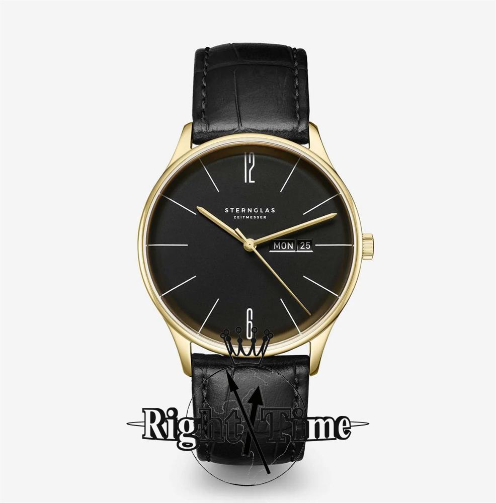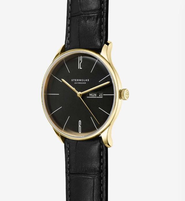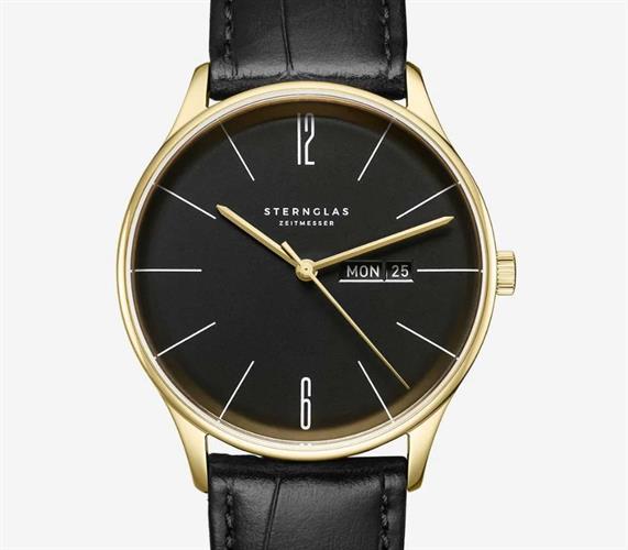 Sternglas Berlin watch model S01-BE04-HE03 powered by quartz movement. Inspired by the Berlin railway station in Hamburg in the 1850s. 316L stainless steel yellow gold plated 38mm case with leather band. Sapphire crystal. Black dial with day/date calendar. Water resistant to 50 meters.