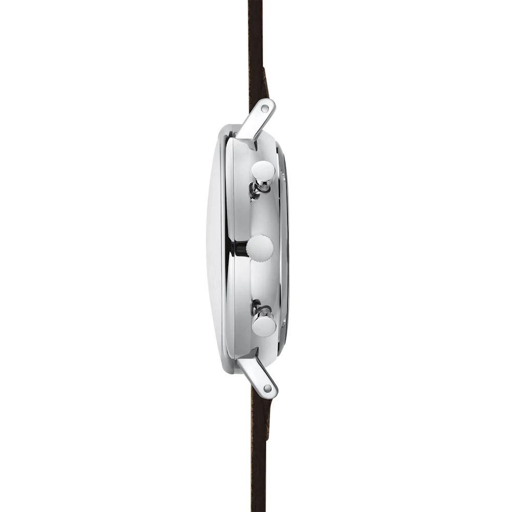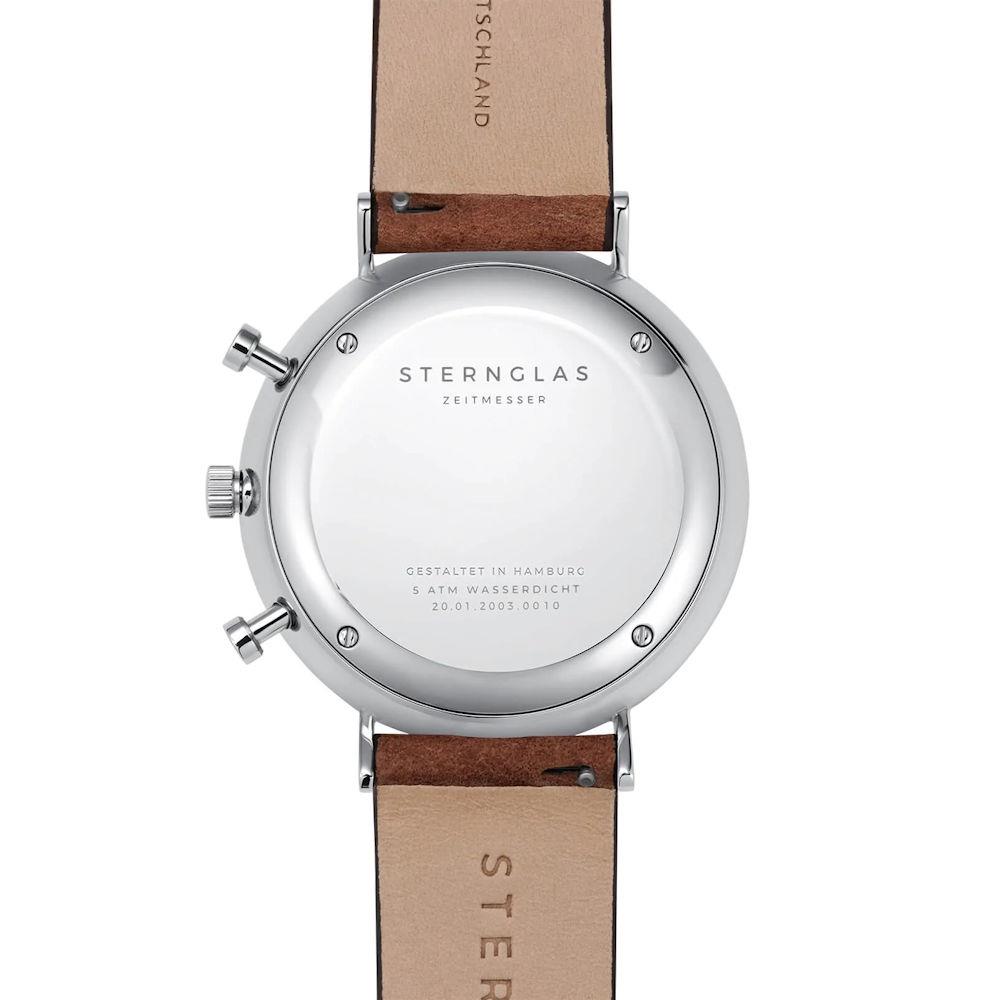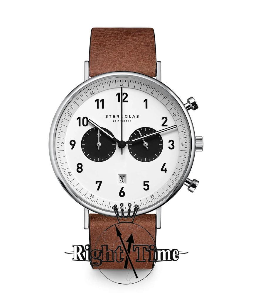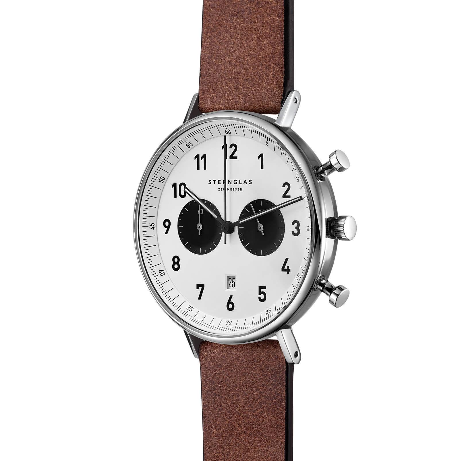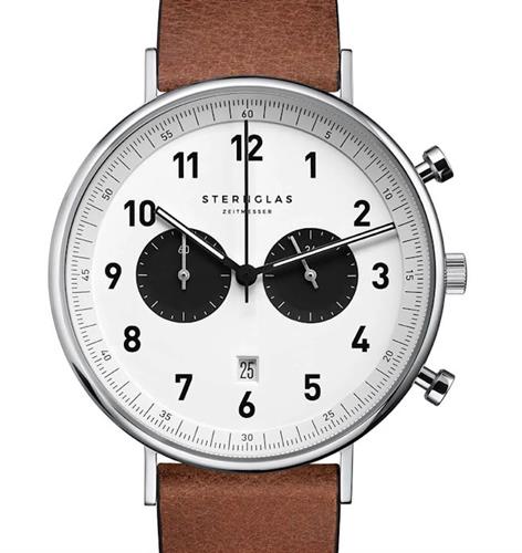 Sternglas watch model S01-CH03-VI14 powered by quartz chronograph movement. 316L stainless steel polished case with brown leather band. Sapphire crystal. "Panda" dial. Water resistant to 50 meters.