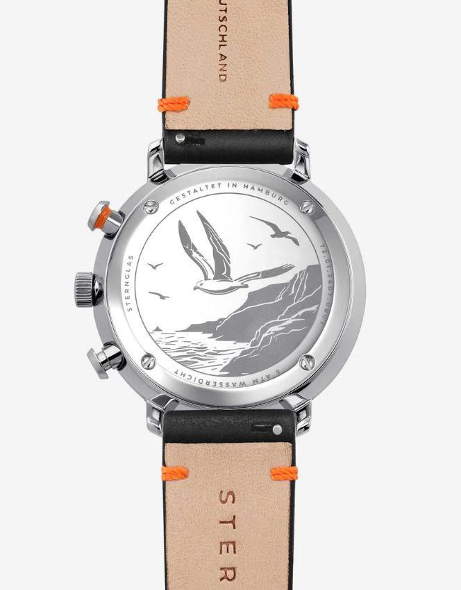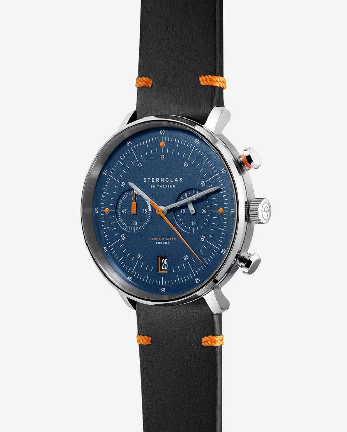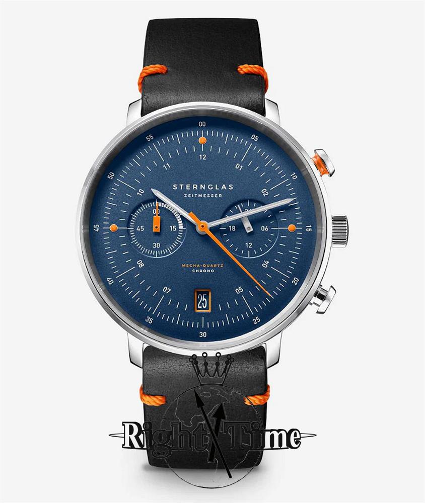 Sternglas Hamburg Chrono Kuster Edition watch model S01-HC06-EB05 powered by quartz chronograph movement. 316L stainless steel polished case with black rubber strap. Sapphire crystal. Dark blue color dial. Water resistant to 50 meters.