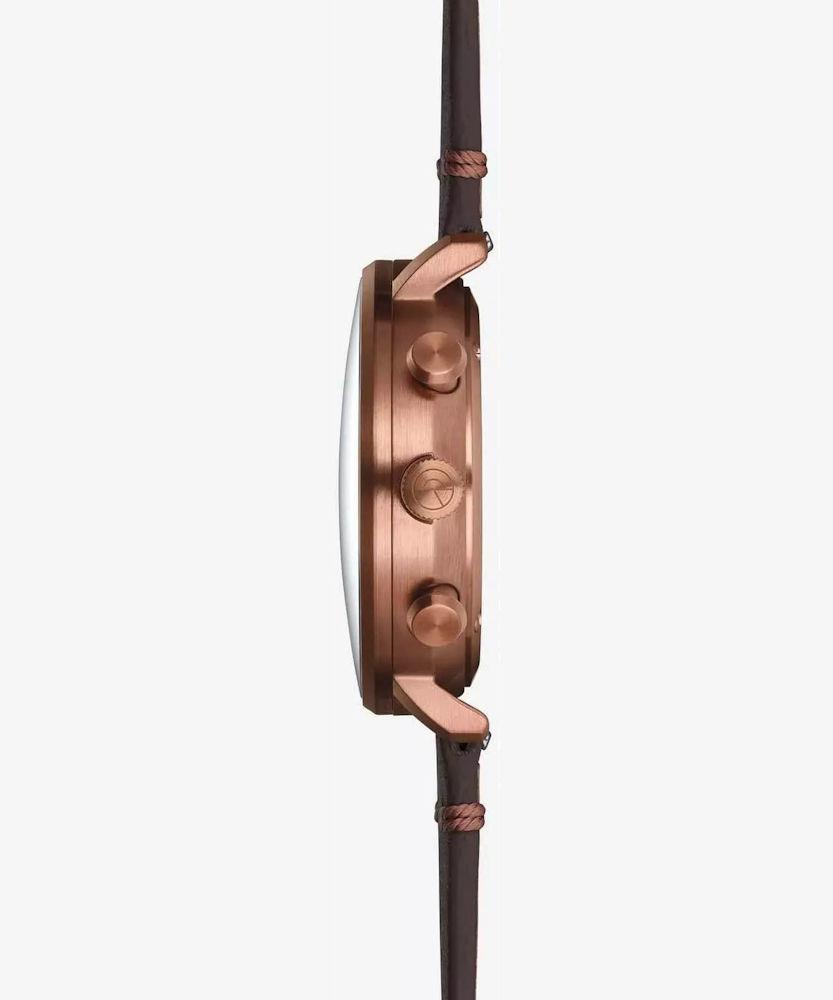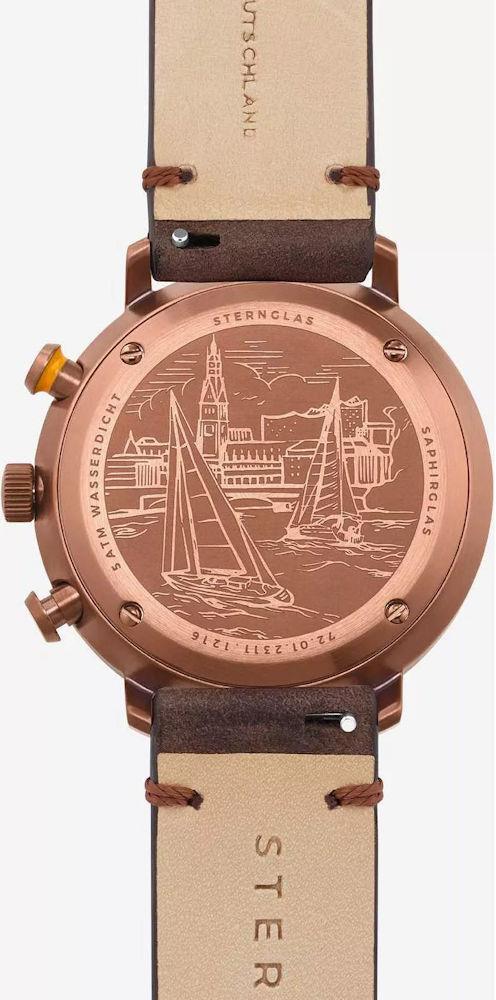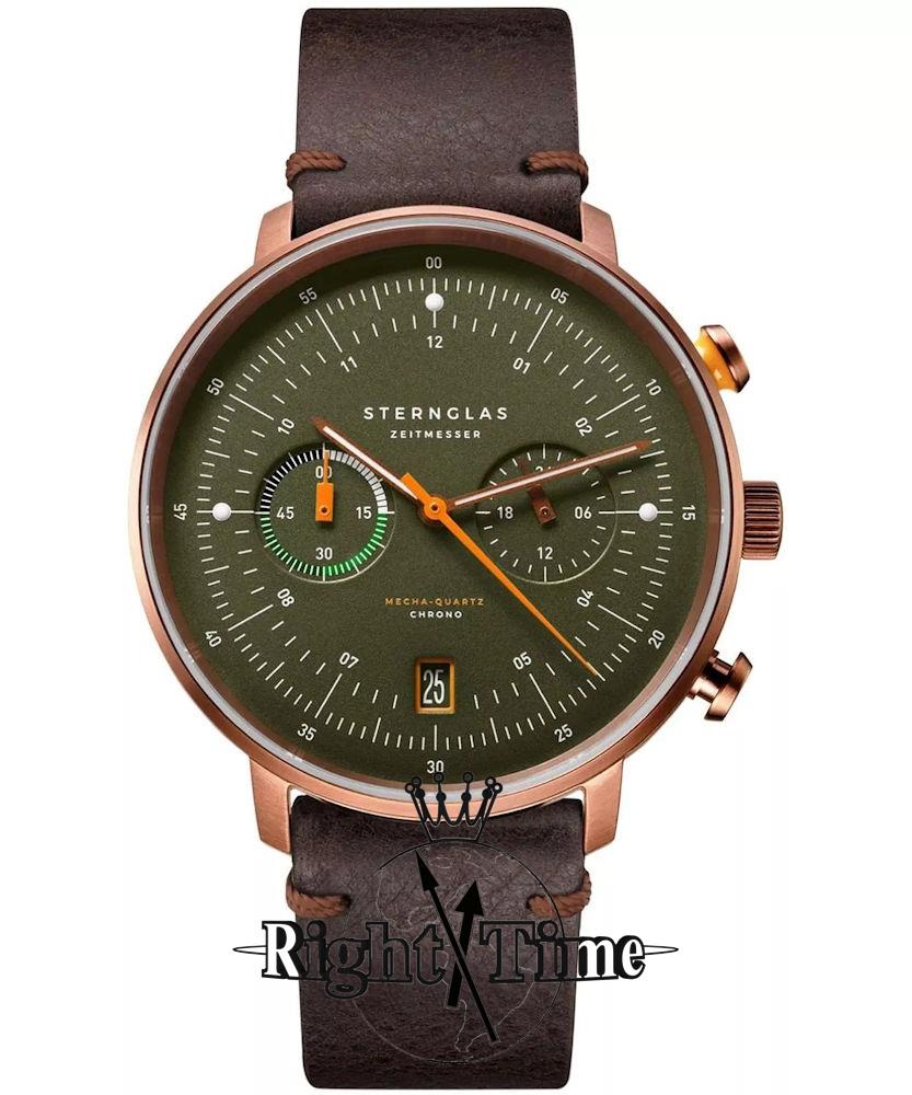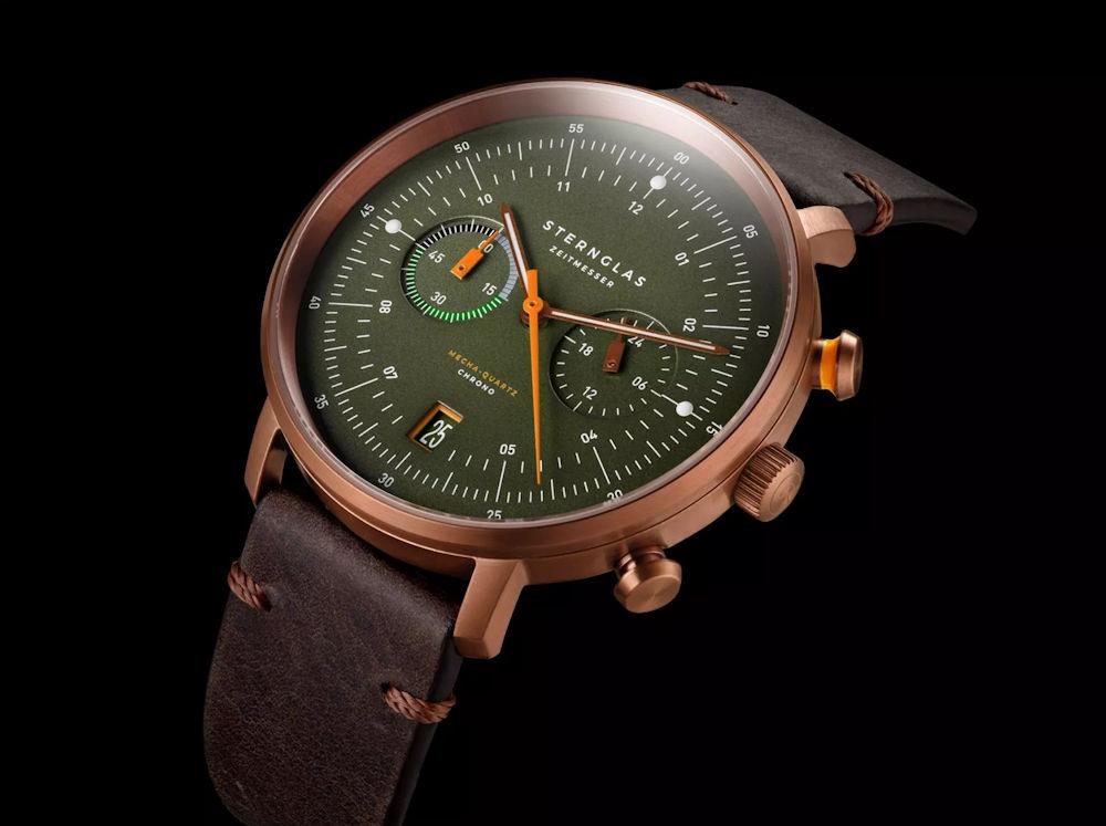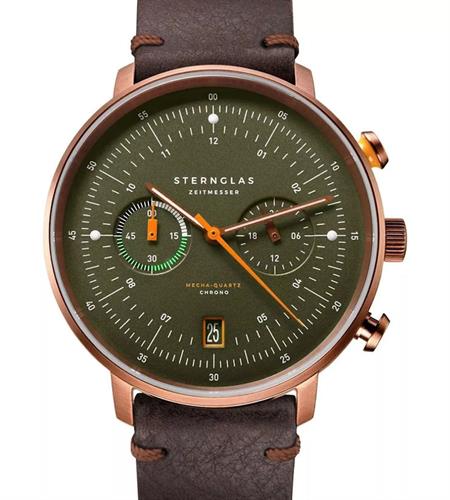 Sternglas Hamburg Mecha-Quartz watch model S01-HC35-VI17. Bronze PVD plated 316L stainless steel case with brown leather strap. Sapphire crystal. Green dial. Water resistant to 50 meters.