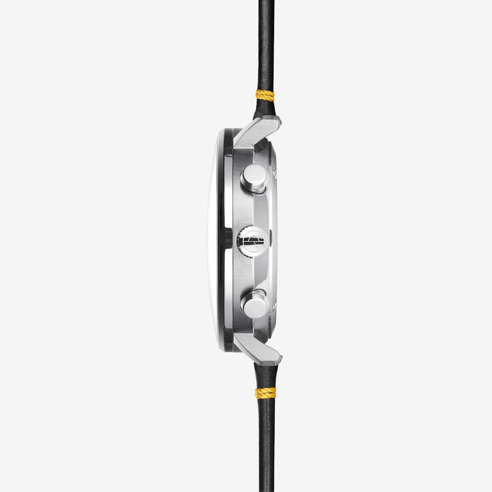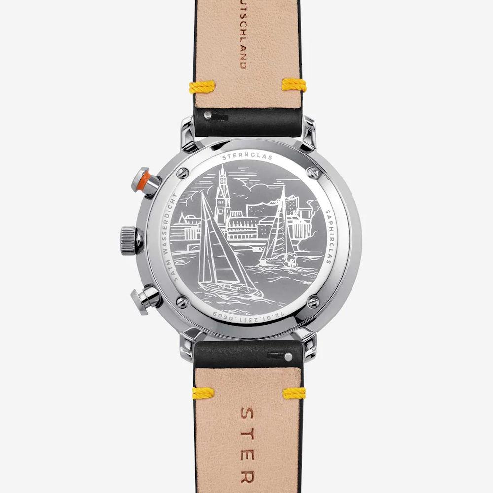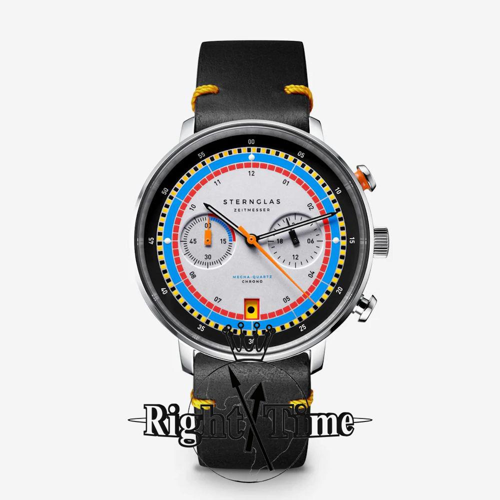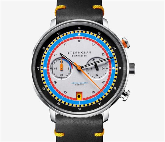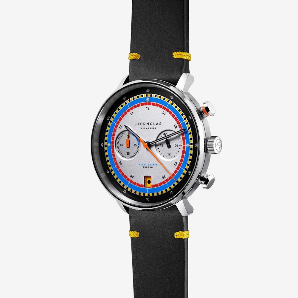 Sternglas Hamburg Regatta watch model S01-HC36-VI22. Inspired by the regatta chronographs of the 70s, primary colors in Bauhaus red, yellow, and blue meet the color world of sailboat racing. 316L stainless steel polished and brushed case with black leather strap. Sapphire crystal. Multi-color dial. Water resistant to 50 meters.