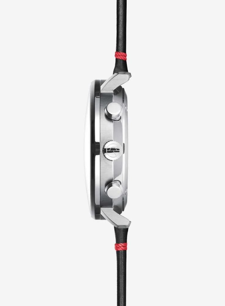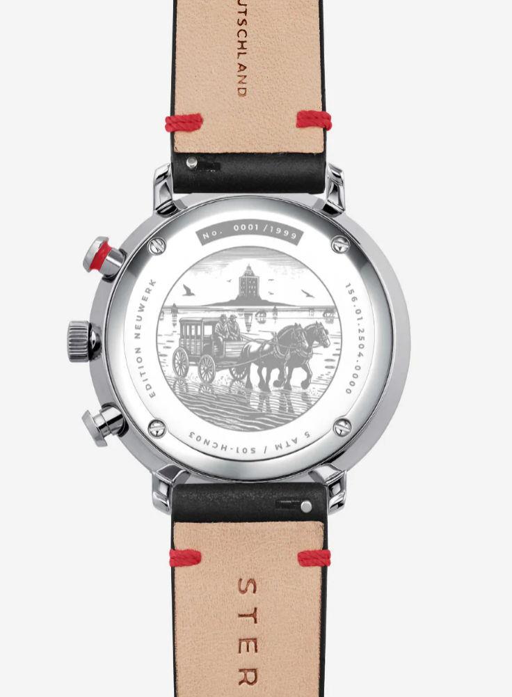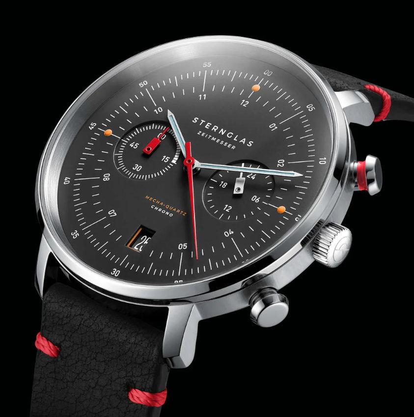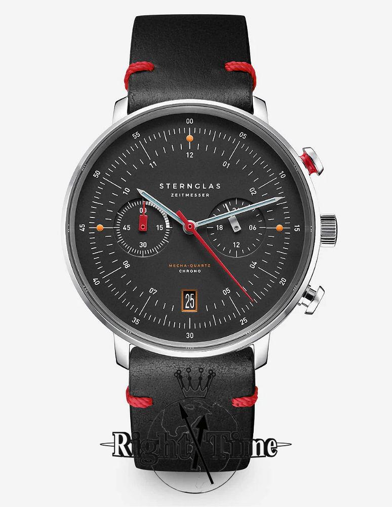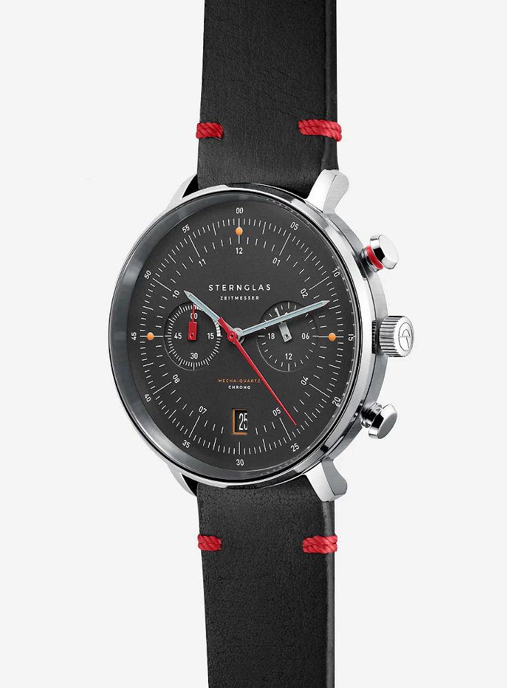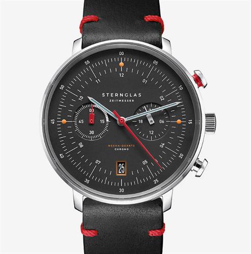 Sternglas Hamburg Mecha-Quartz watch model S01-HCN03-VI29. 316L stainless steel case with black leather strap. Red color accents. Sapphire crystal. Black dial. Water resistant to 50 meters.