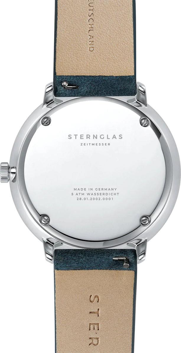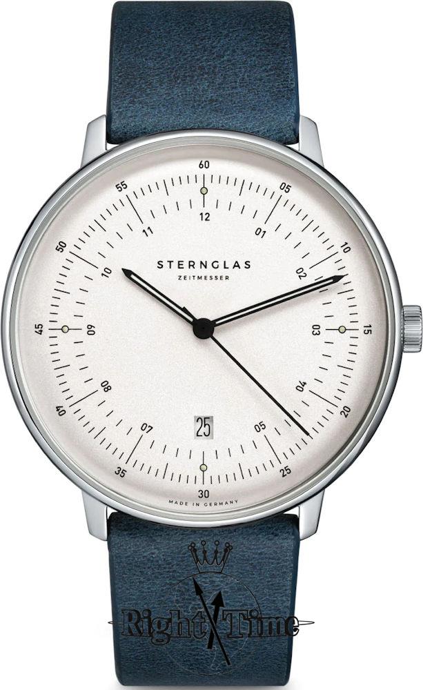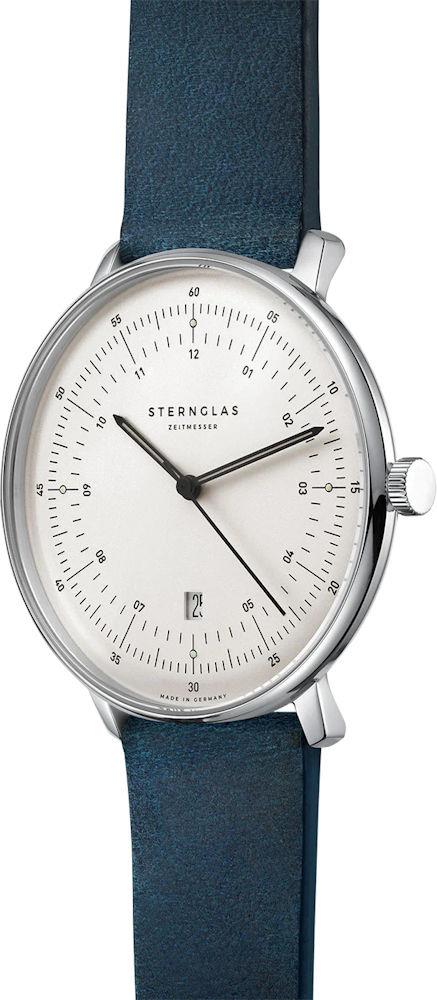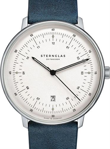 Sternglas Hamburg watch model S01-HH10-Vi13 powered by quartz movement. 316L stainless steel 42mm ultra thin case with blue leather band. Sapphire crystal. Silver color dial. Water resistant to 50 meters.