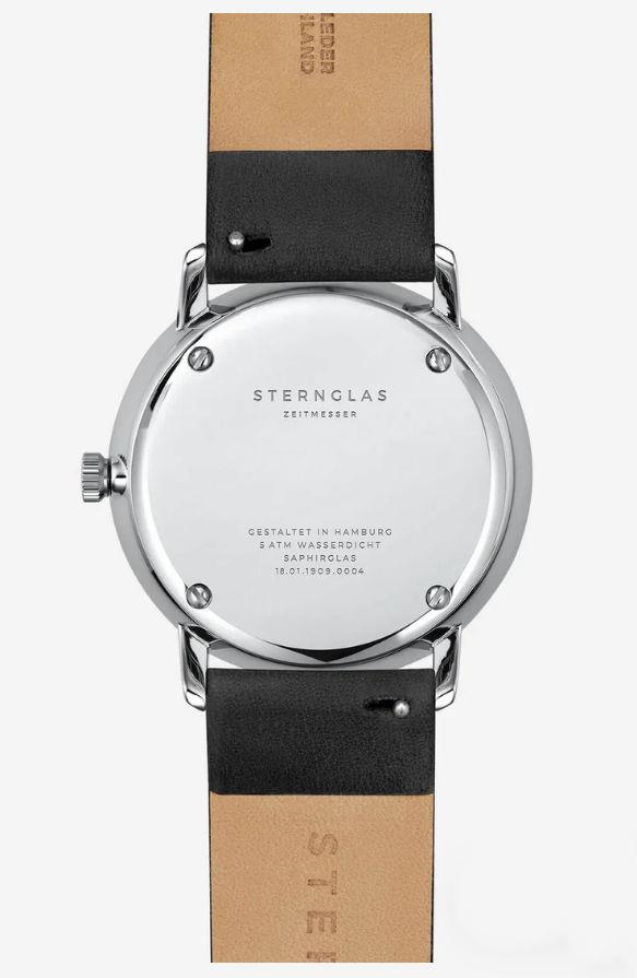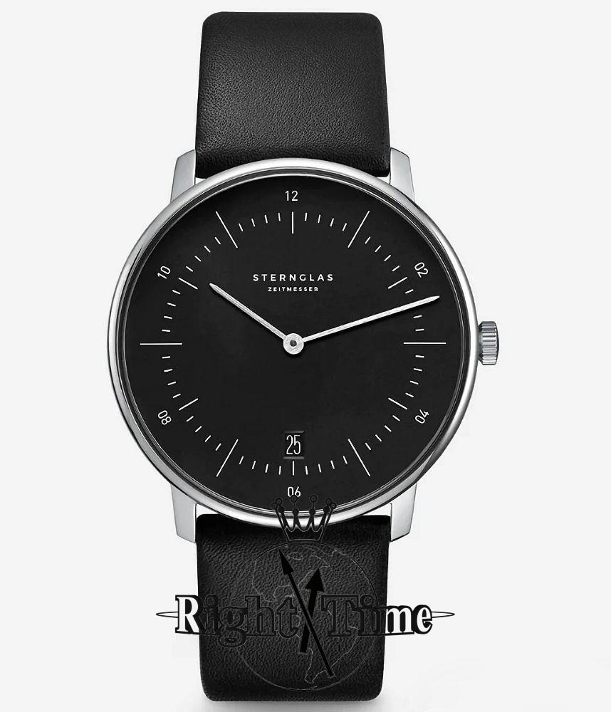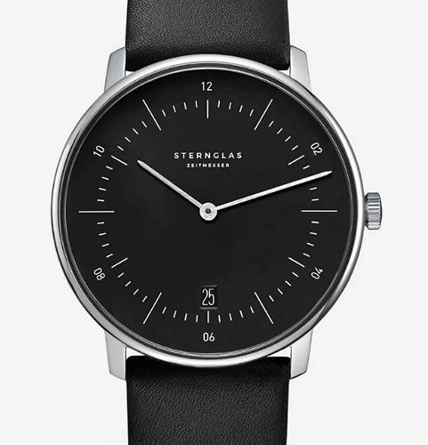 Sternglas Naos watch model S01-NA03-PR07 powered by quartz movement. 316L stainless steel 38mm case with black leather band. Sapphire crystal. Black dial. Water resistant to 50 meters.