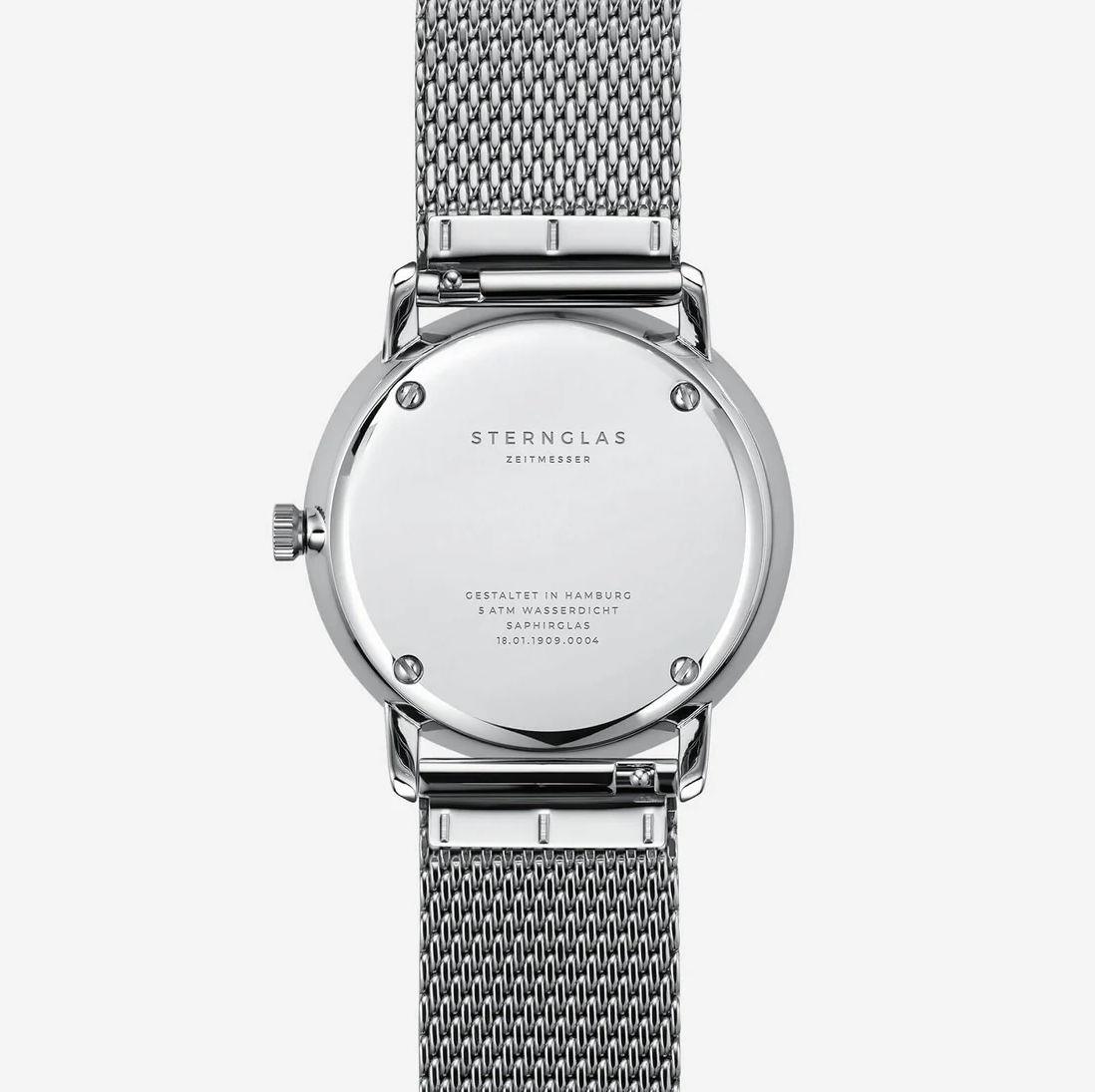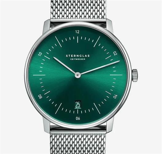 Sternglas Naos watch model S01-NA08-Mi04 powered by quartz movement. 316L stainless steel 38mm case with mesh bracelet. Sapphire crystal. Green dial. Water resistant to 50 meters.