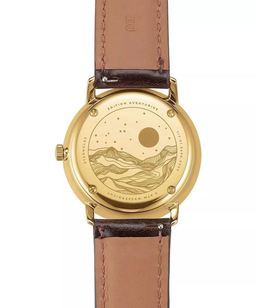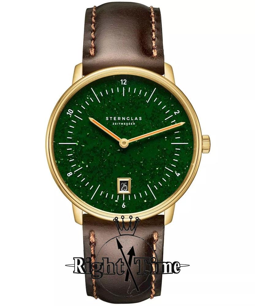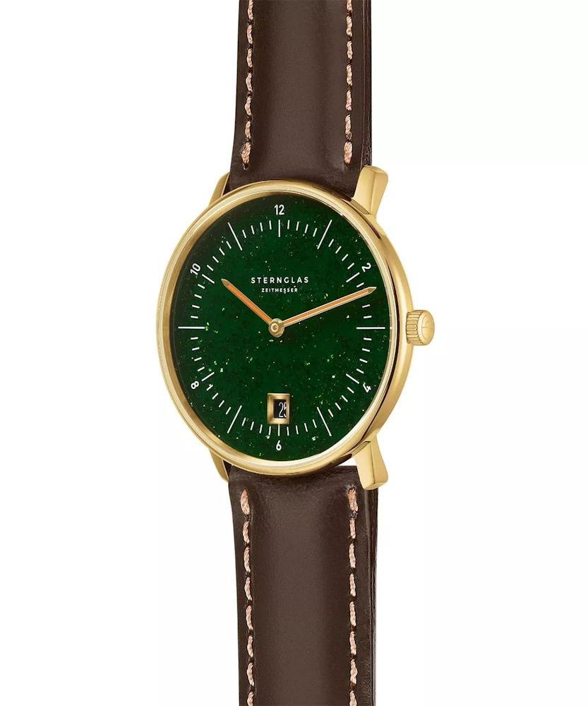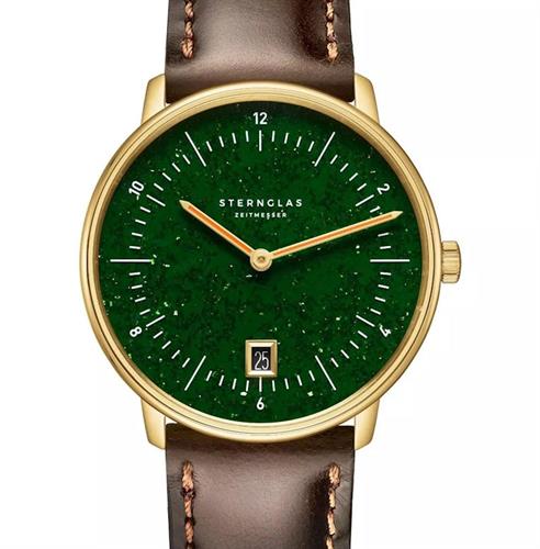Sternglas Naos Aventurine Special Edition watch model S01-NAN41-BR01 powered by quartz movement. 316L stainless steel polished gold plated case with dark brown leather strap. Sapphire crystal. Green color dial. Water resistant to 50 meters.