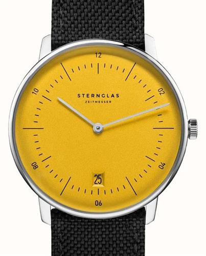 Sternglas Naos watch model S01-NAY23-NY01 powered by quartz movement. 316L stainless steel 38mm case with black nylon strap. Sapphire crystal. Yellow dial. Water resistant to 50 meters.