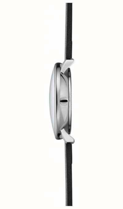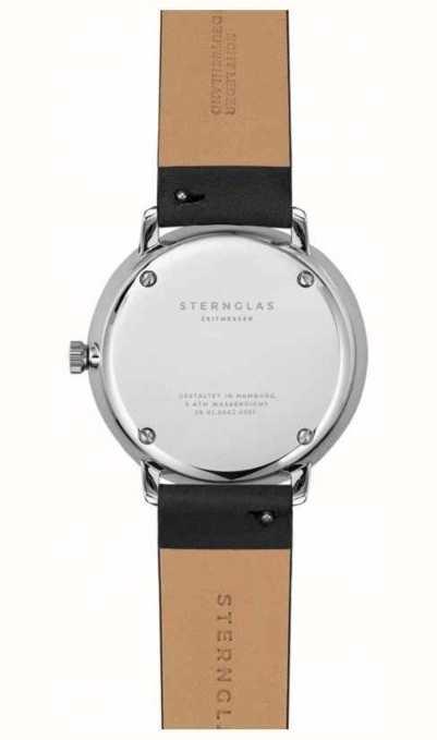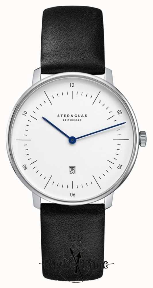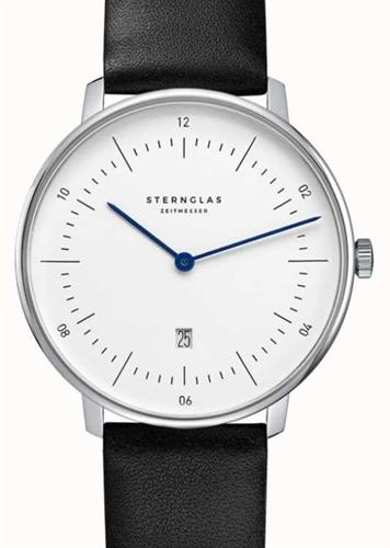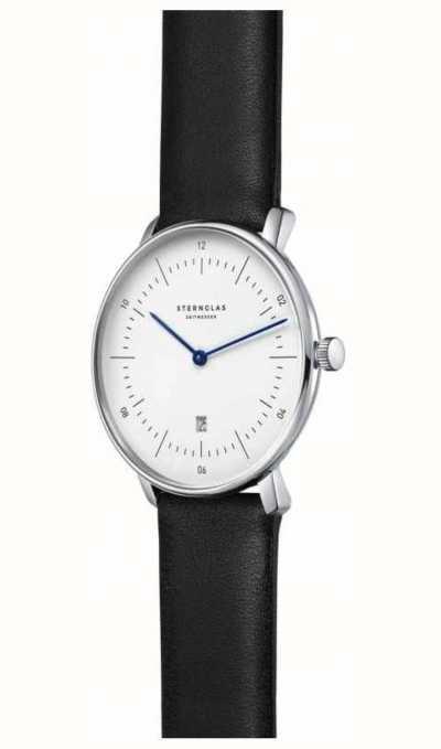 Sternglas Naos XS watch model S01-ND01-KL05 powered by quartz movement. 316L stainless steel 33mm case with black leather band. Sapphire crystal. White dial. Water resistant to 50 meters.
