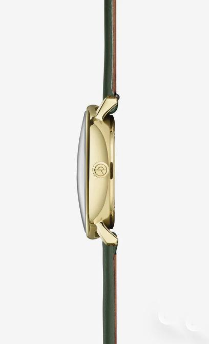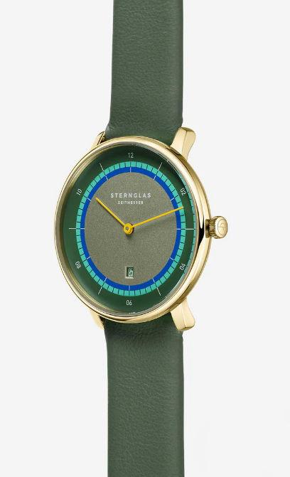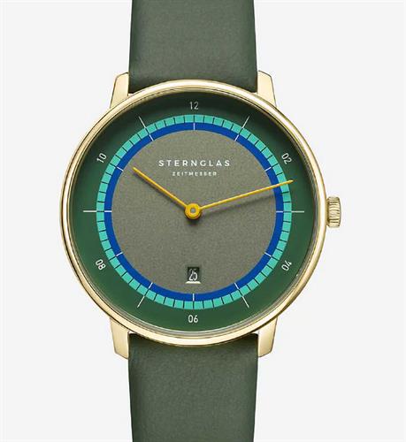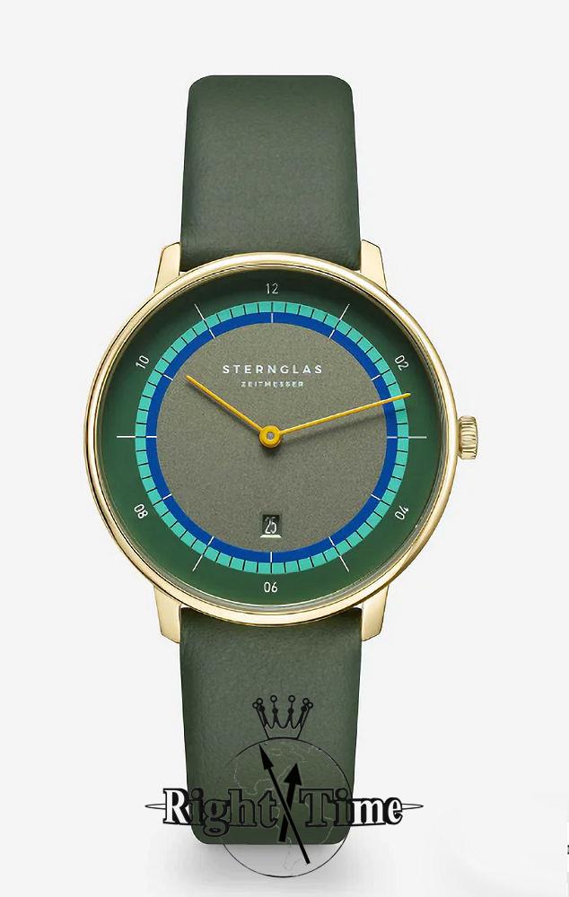Sternglas Naos XS Edition Argo watch model S01-NDA22-KL09 powered by quartz movement. 316L gold plated stainless steel 33mm case with green leather band. Sapphire crystal. Green dial. Water resistant to 50 meters.