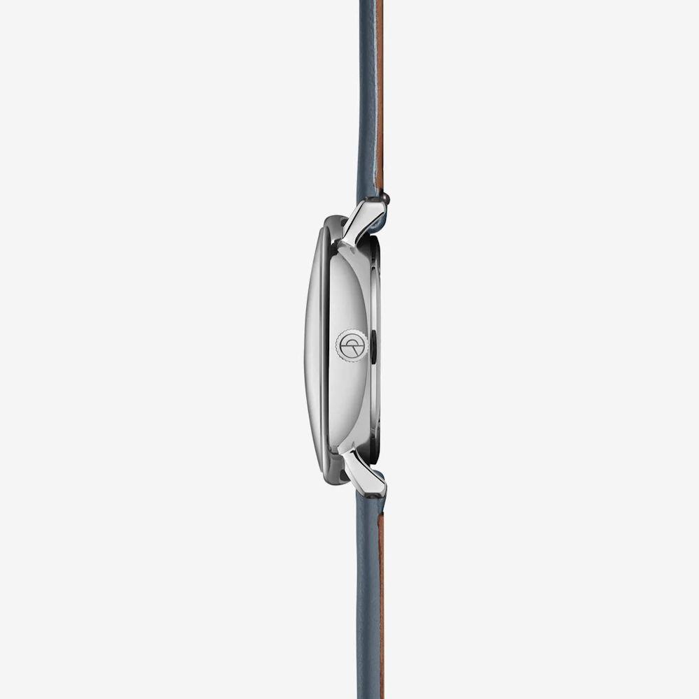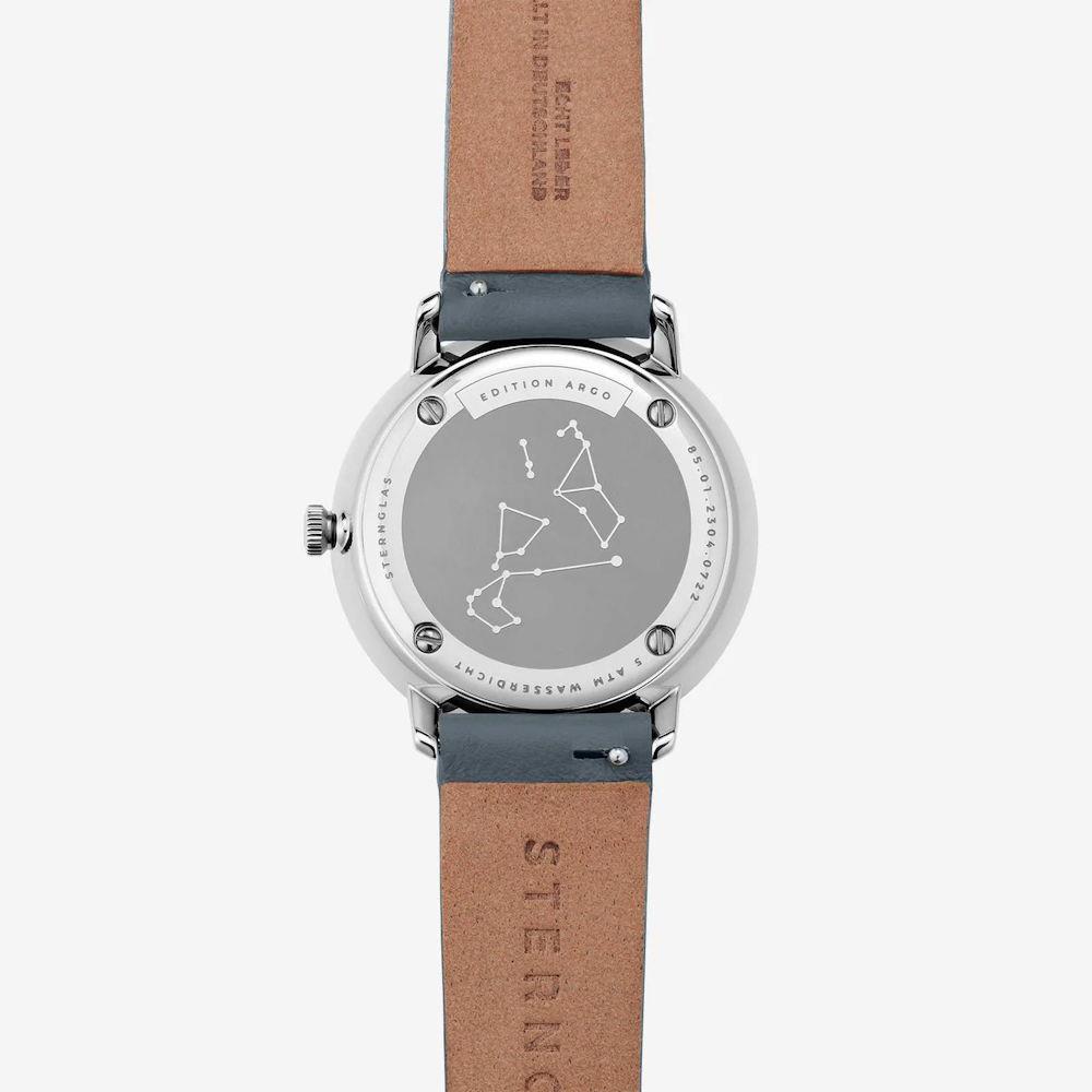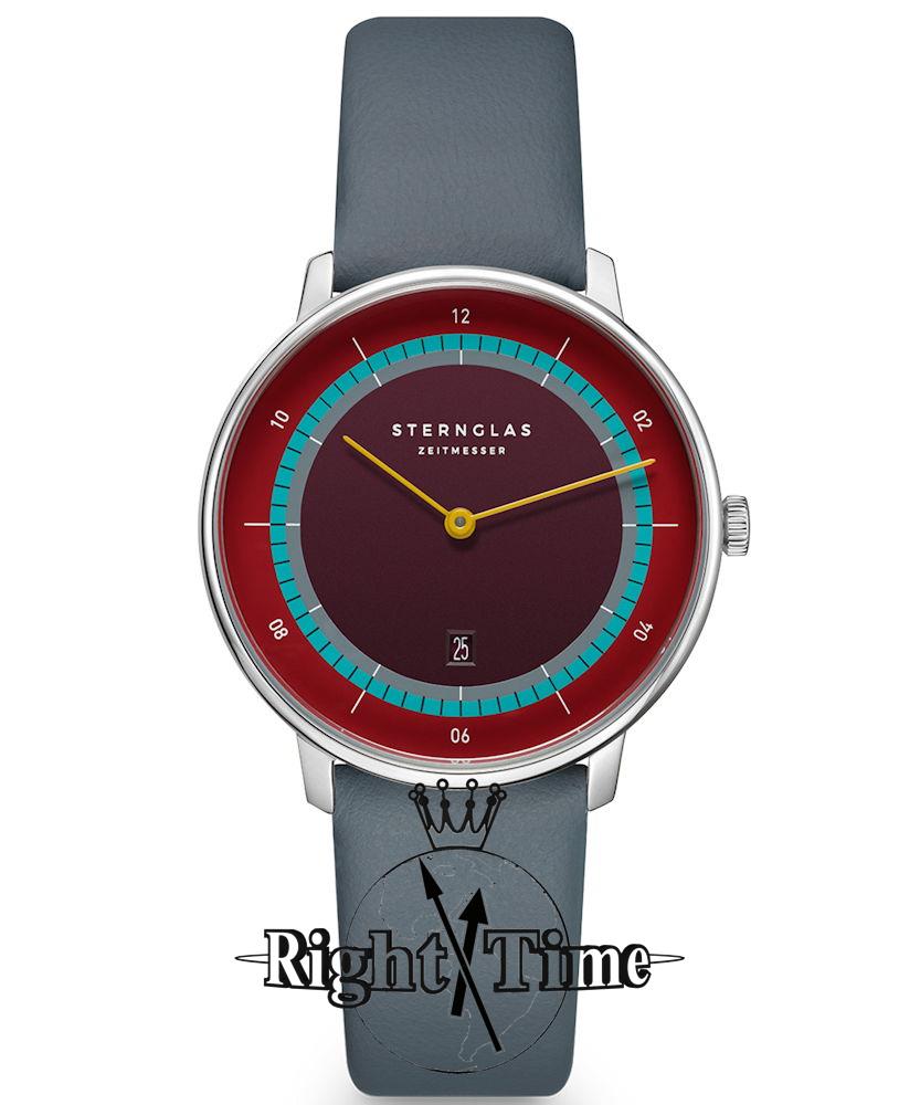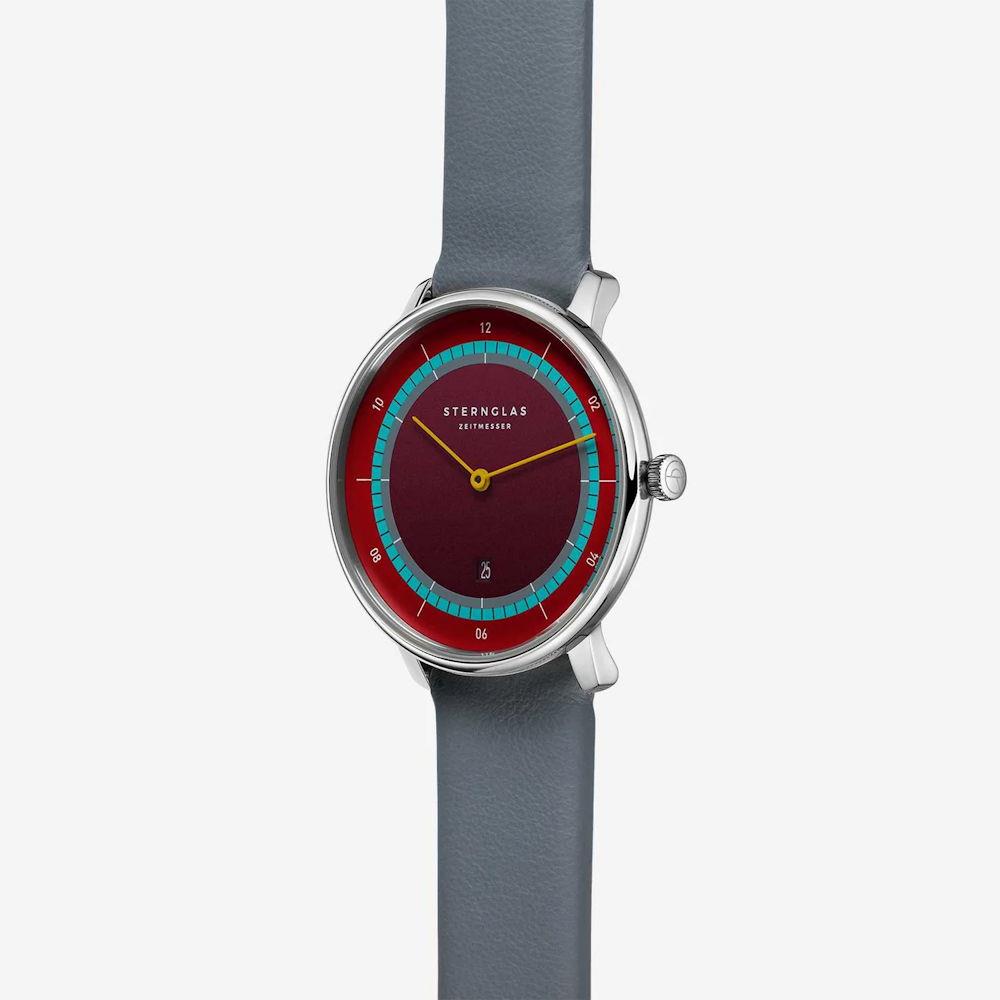 Sternglas Naos XS Edition Argo watch model S01-NDA24-KL10 powered by quartz movement. 316L stainless steel 33mm case with grey leather band. Sapphire crystal. Red dial. Water resistant to 50 meters.