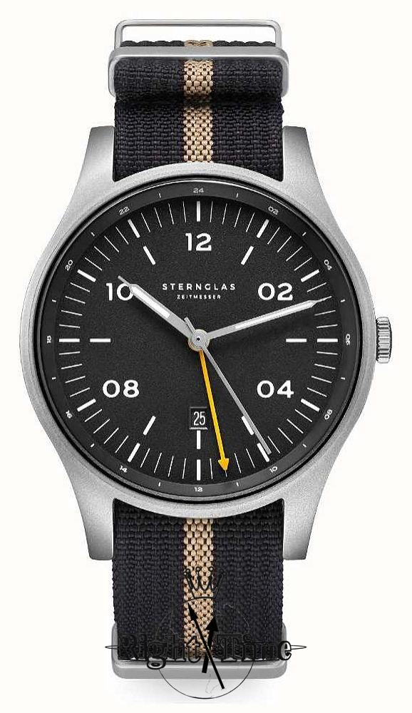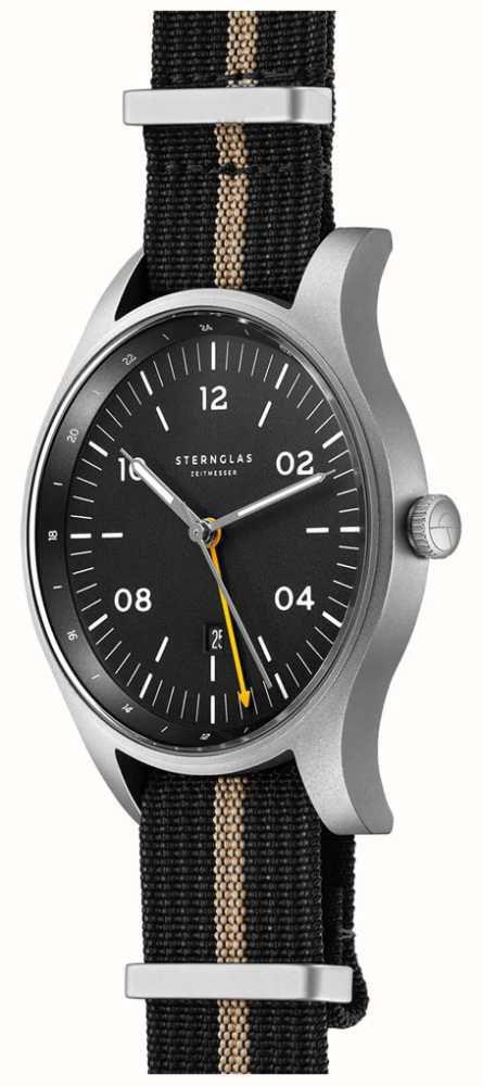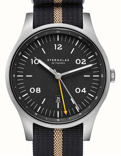 Sternglas Taiga GMT watch model S01-TA11-NA04 powered by quartz movement. 316L stainless steel 42mm case with NATO style strap. Sapphire crystal. Black dial with Arabic numerals and second time-zone hand. Water resistant to 100 meters.