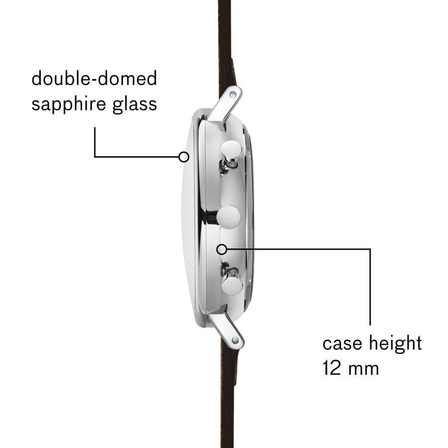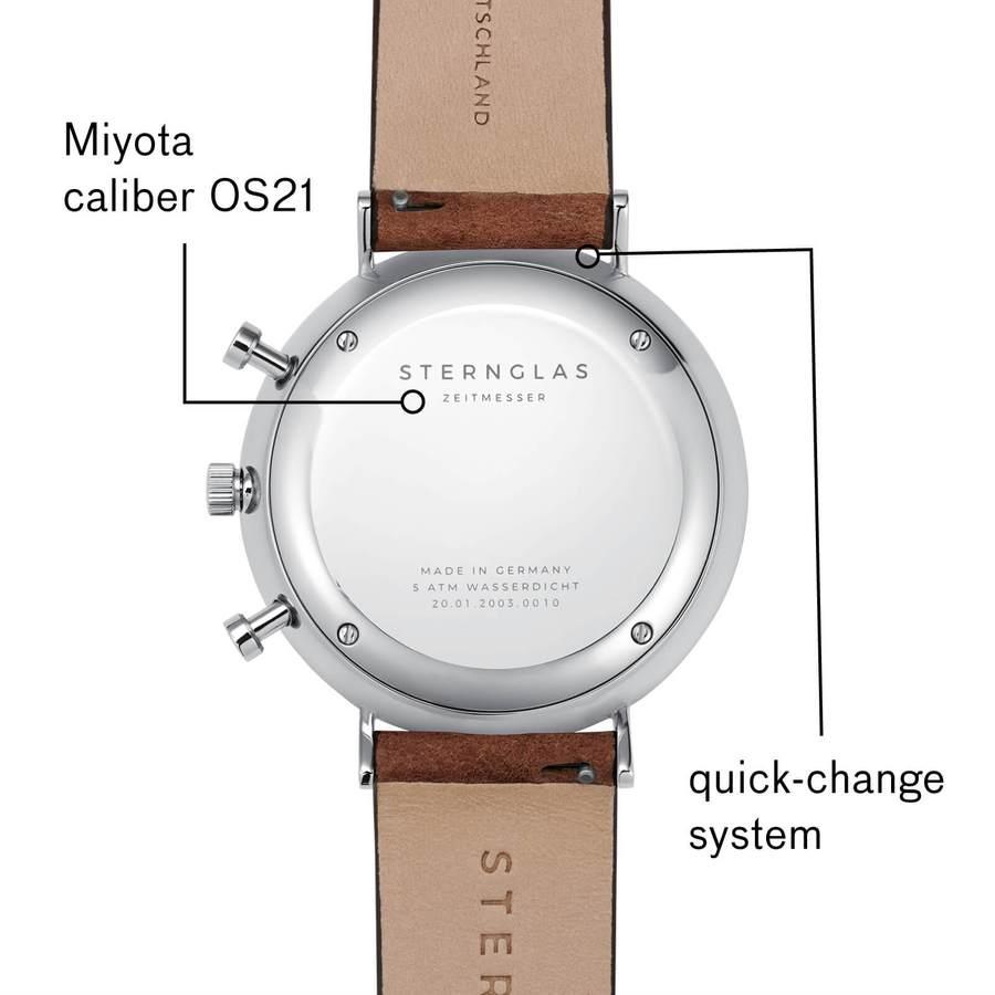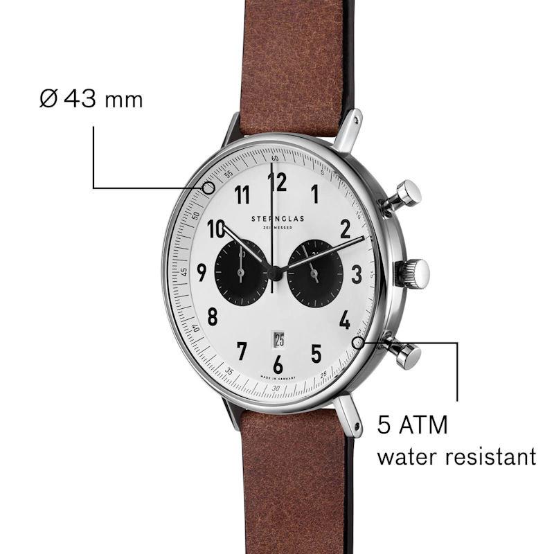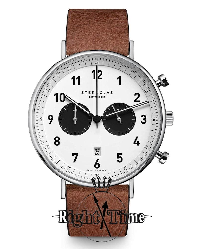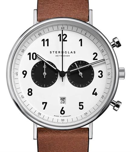Sternglas chono "black and white Panda" watch model SCH03/316 powered by quartz chronograph movement. 316L stainless steel case with brown leather band. Sapphire crystal. White dial with black sub-dials. Water resistant to 50 meters.