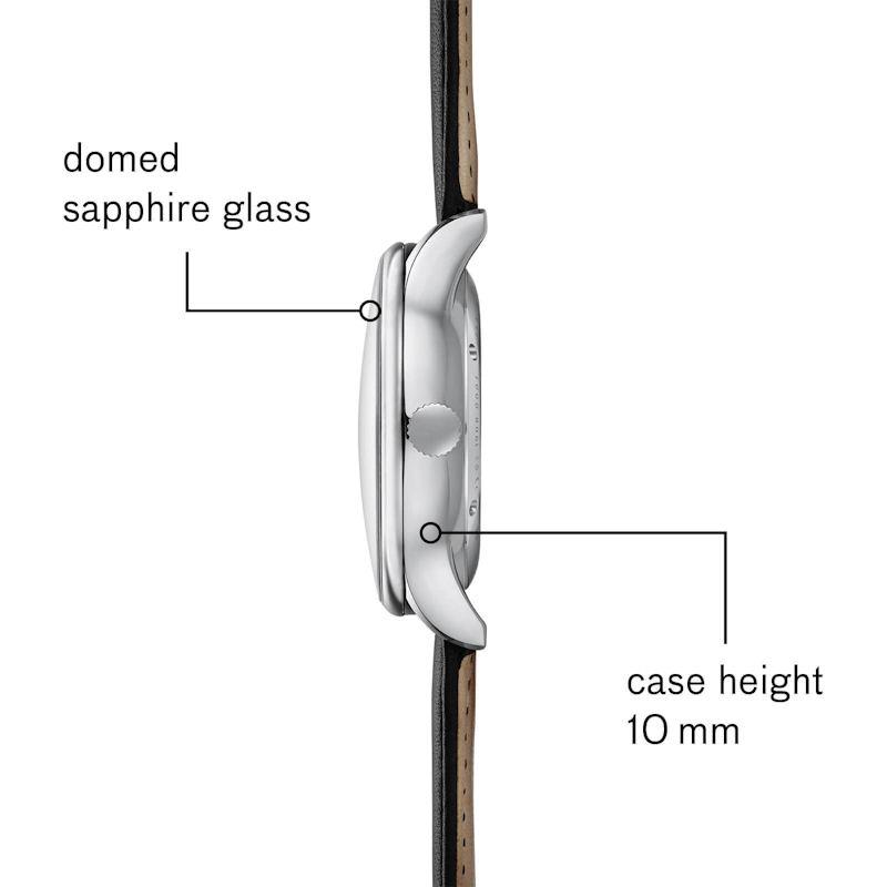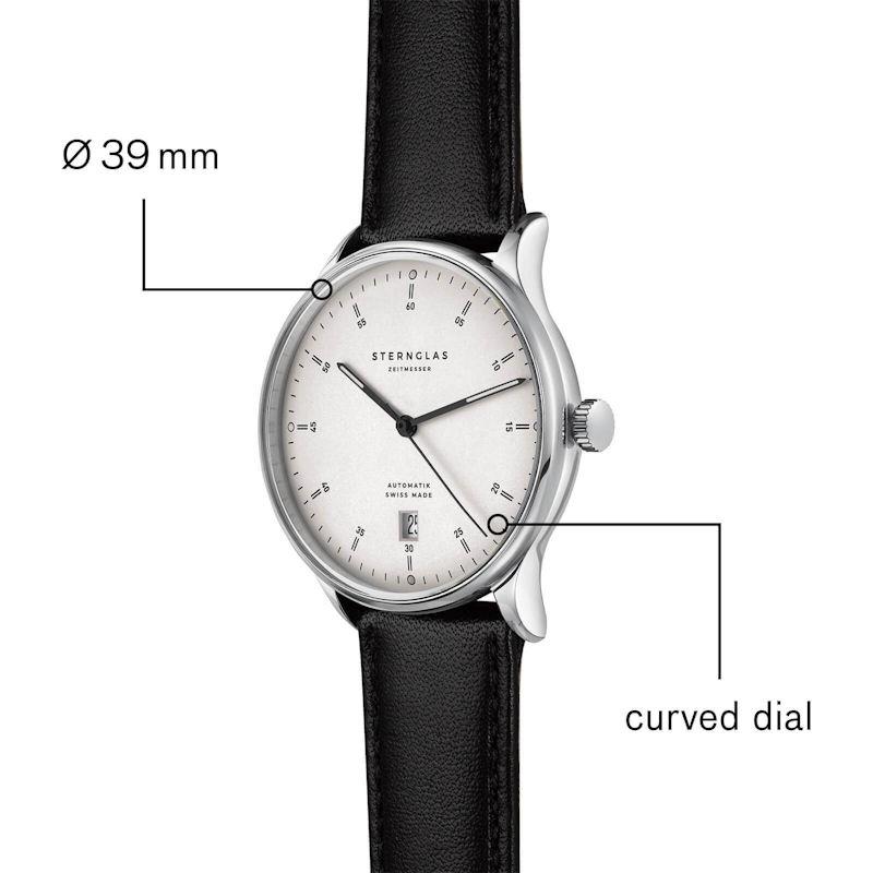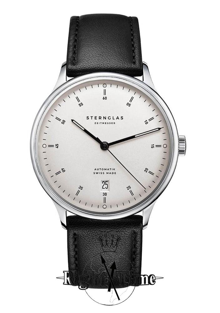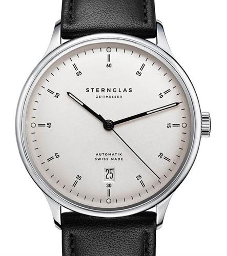 Sternglas Kanton watch model SKT41/701 powered by Swiss automatic movement. 316L stainless steel case with black leather band. Sapphire crystal. Silver color dial with date. Water resistant to 30 meters.