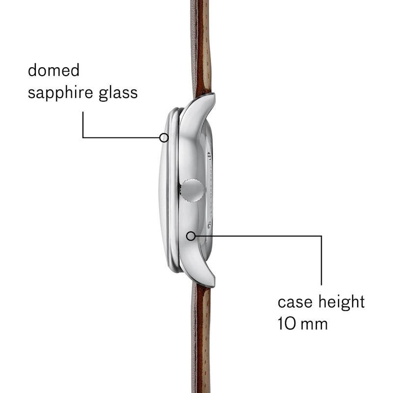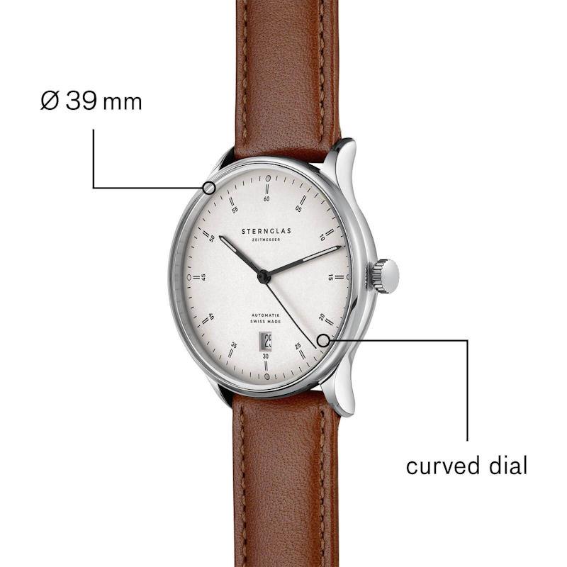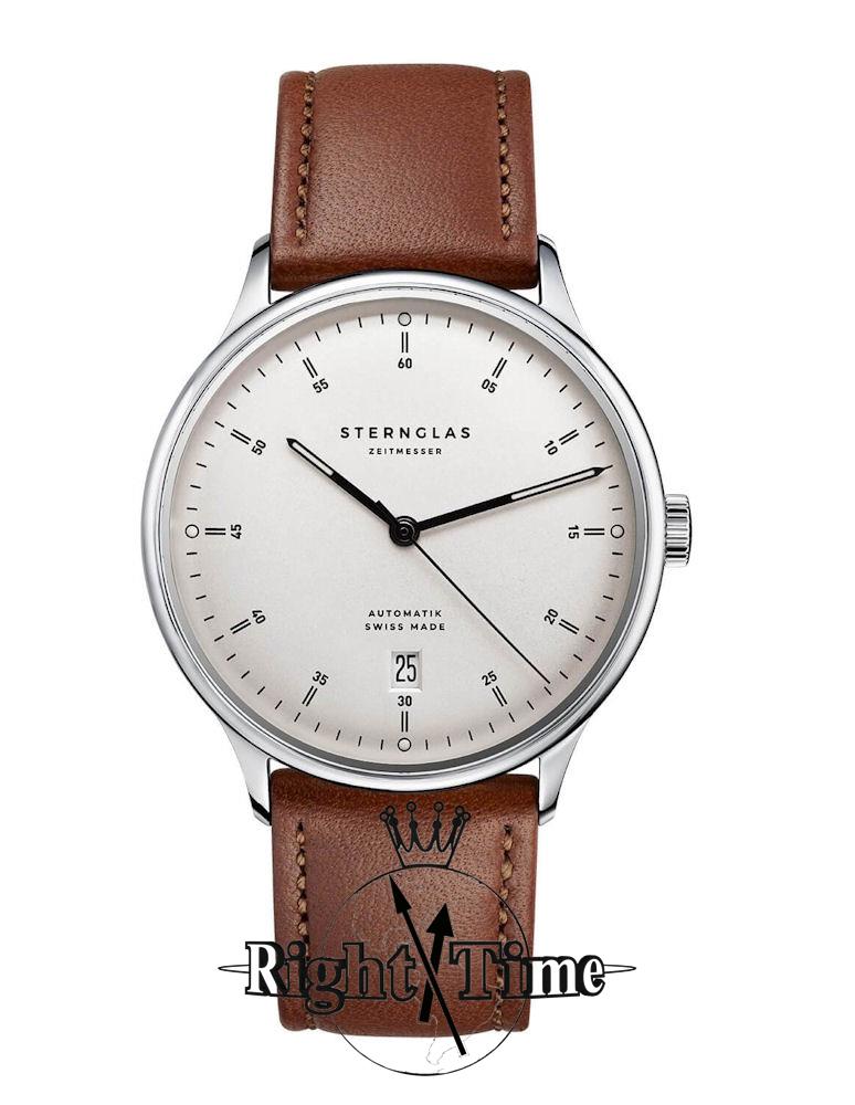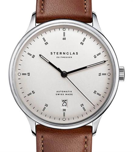 Sternglas Kanton watch model SKT41/702 powered by Swiss automatic movement. 316L stainless steel case with brown leather band. Sapphire crystal. Silver color dial with date. Water resistant to 30 meters.
