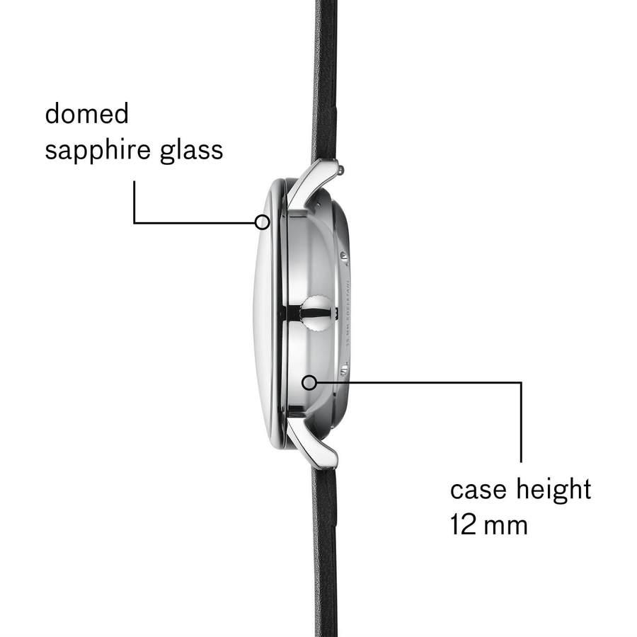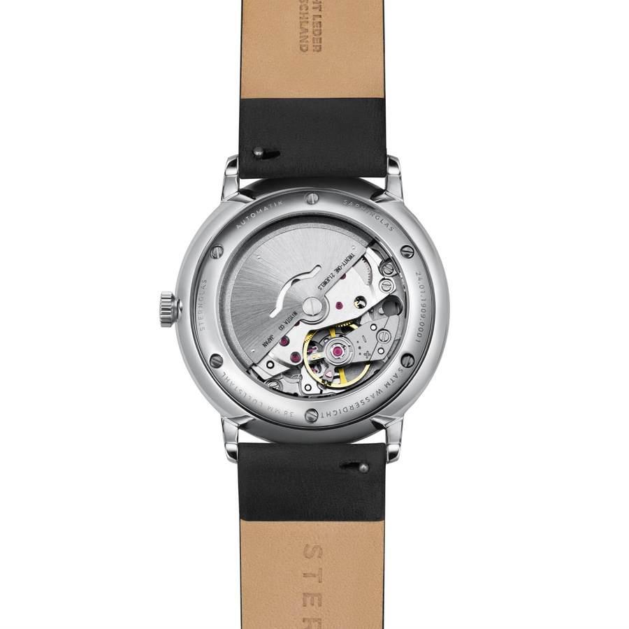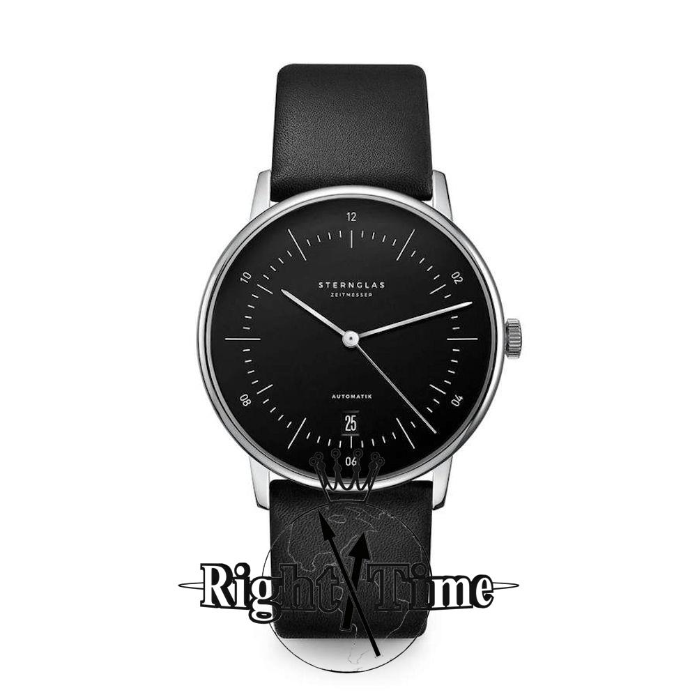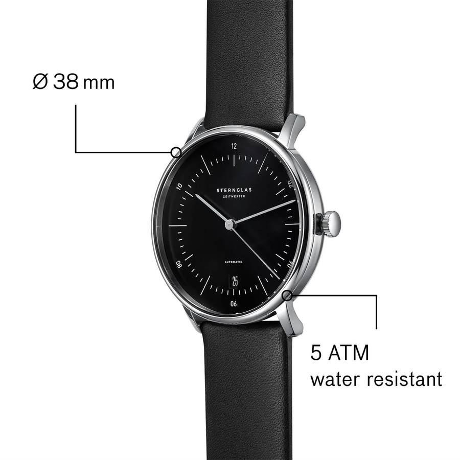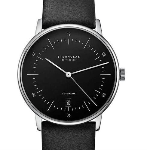 Sternglas Naos watch model SNA11/108 powered by Japanese automatic movement. 316L stainless steel case with black leather band. Sapphire crystal. Black dial with date. Water resistant to 50 meters.